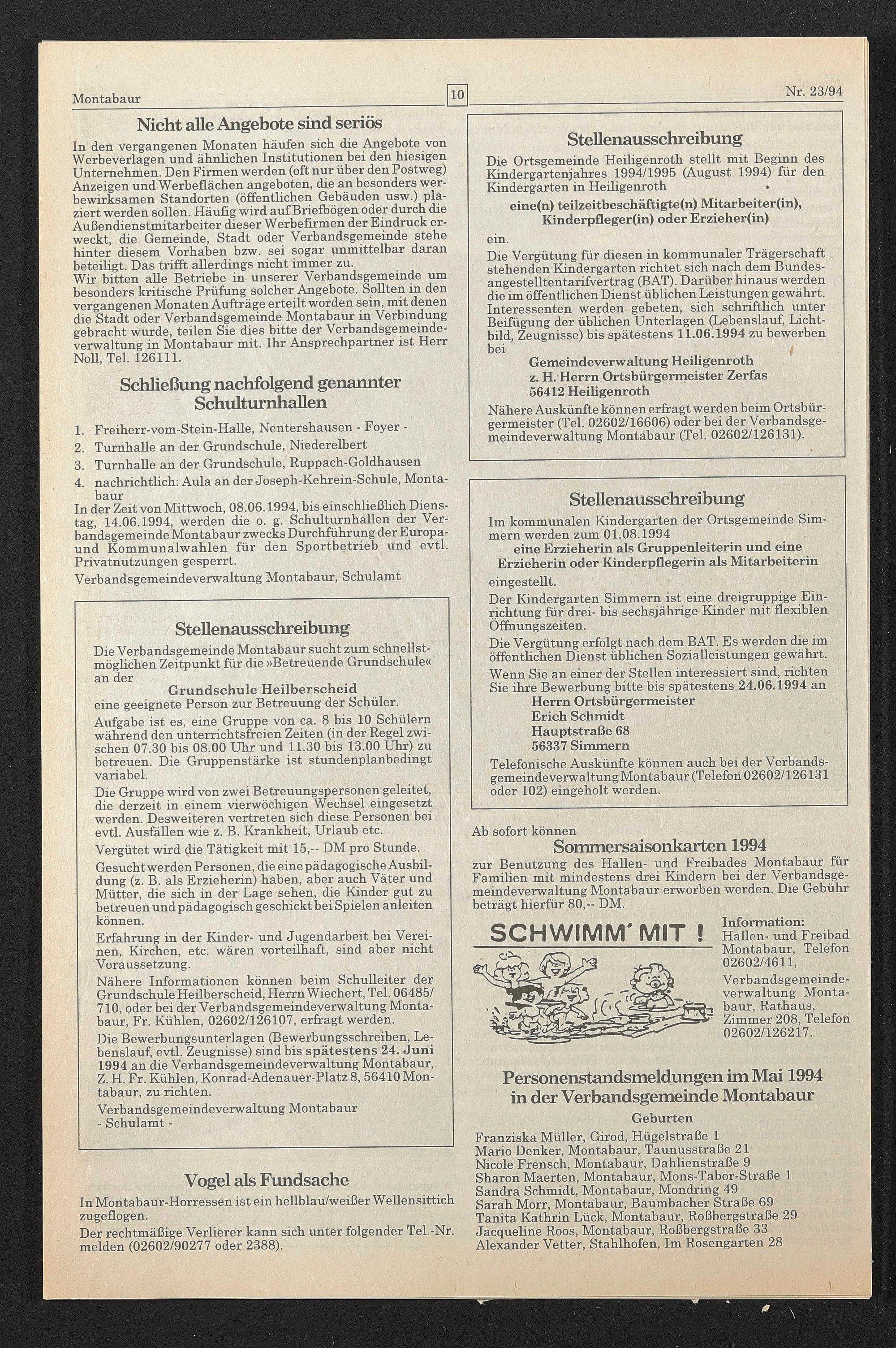 Die Bewerbungsunterlagen (Bewerbungsschreiben, Lebenslauf, evtl. Zeugnisse) sind bis spätestens 24. Juni 1994 an die Verbandsgemeindeverwaltung Montabaur, Z. H. Fr. Kühlen, Konrad-Adenauer-Platz 8, 56410 Montabaur, zu richten.