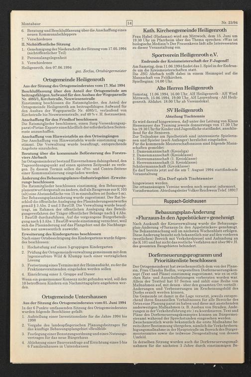 Aus der Sitzung des Ortsgemeinderates vom 17. Mai 1994