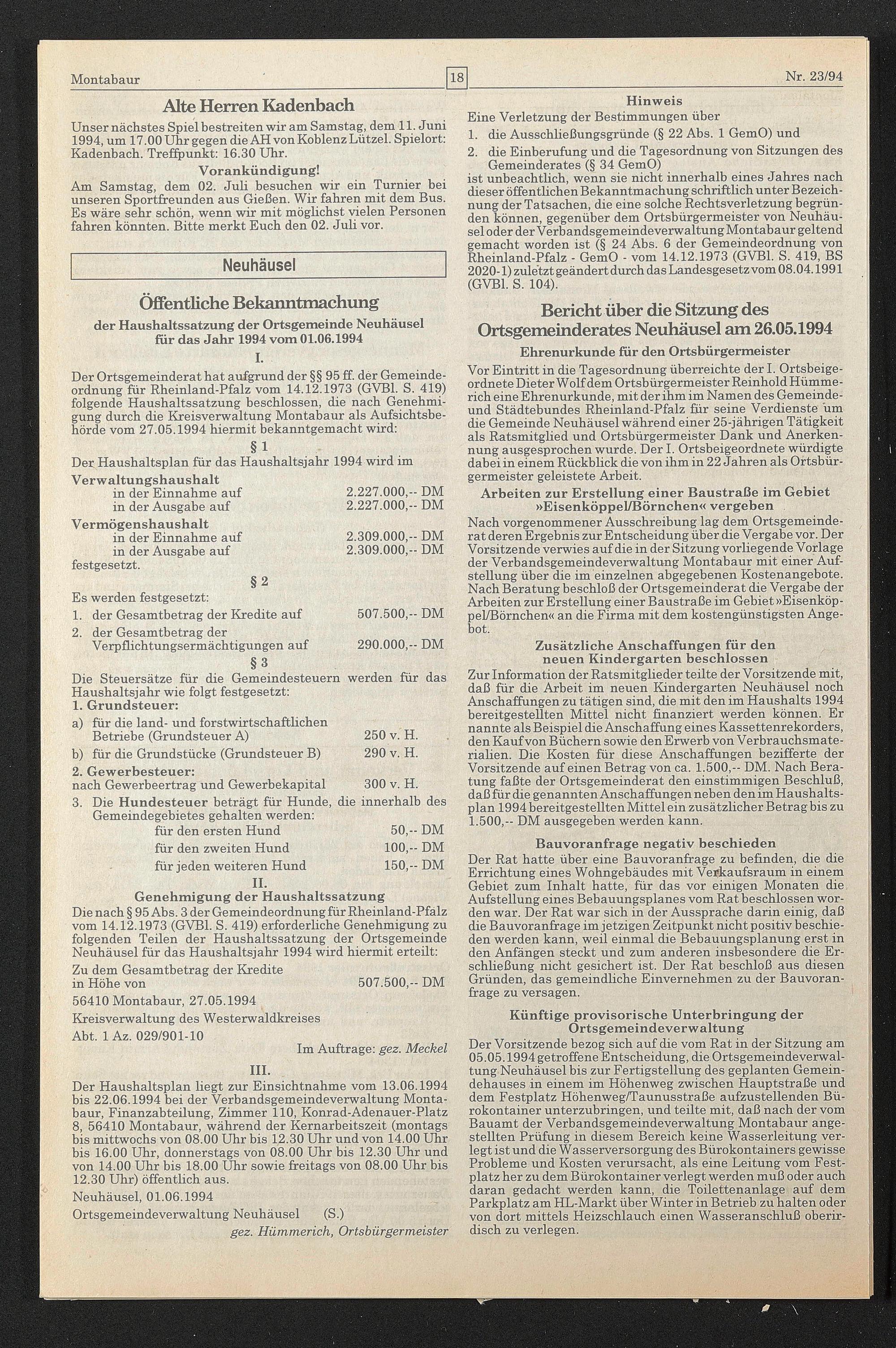 Bericht über die Sitzung des Ortsgemeinderates Neuhäusel am 26.05.1994
