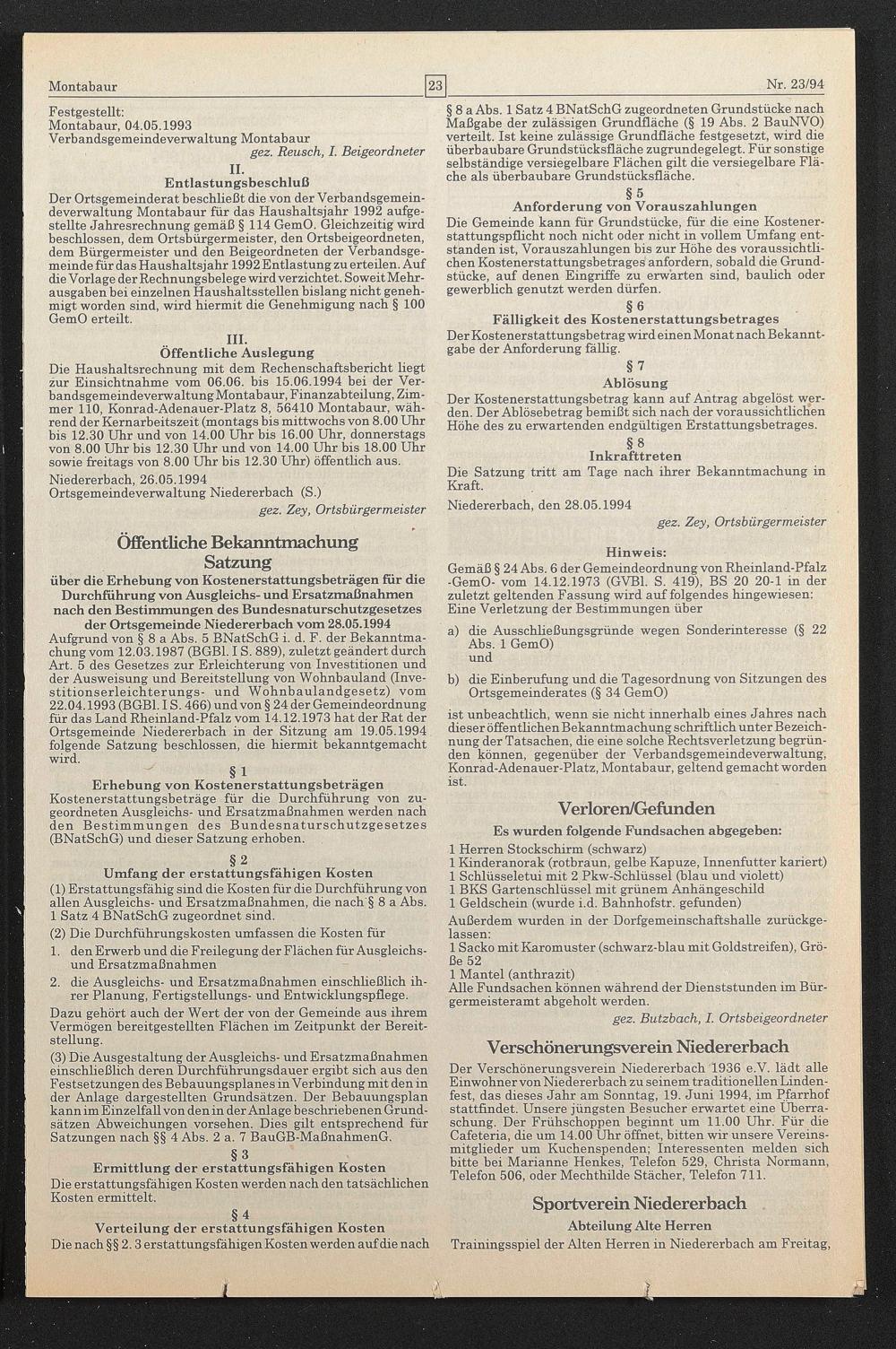 Die Haushaltsrechnung mit dem Rechenschaftsbericht Hegt zur Einsichtnahme vom 06.06. his 15.06.1994 bei der Verbandsgemeindeverwaltung Montabaur, Finanzabteilung, Zimmer 110, Konrad-Adenauer-Platz 8, 56410 Montabaur, während der Kernarbeitszeit (montags bis mittwochs von 8.00 Uhr bis 12.30 Uhr und von 14.00 Uhr bis 16.00 Uhr, donnerstags von 8.00 Uhr bis 12.30 Uhr und von 14.00 Uhr bis 18.00 Uhr sowie freitags von 8.00 Uhr bis 12.30 Uhr) öffenthch aus.