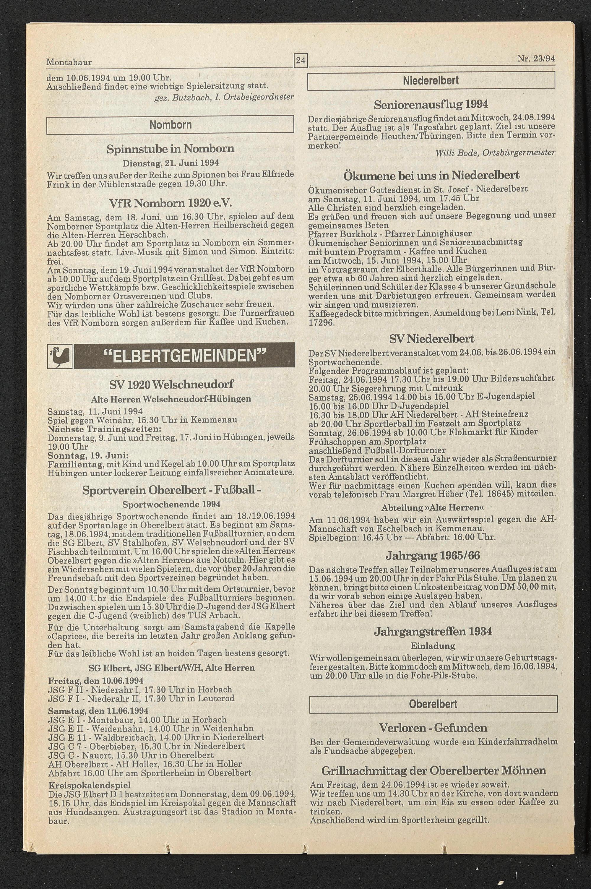 Das diesjährige Sportwochenende findet am 18./19.06.1994 auf der Sportanlage in Oberelbert statt. Es beginnt am Samstag, 18.06.1994, mit dem traditionellen Fußballturnier, an dem die SG Elbert, SV Stahlhofen, SV Welschneudorf und der SV Fischbach teilnimmt. Um 16.00 Uhr spielen die »Alten Herren« Oberelbert gegen die »Alten Herren« aus Nottuln. Hier gibt es ein Wiedersehen mit vielen Spielern, die vor über 20 Jahren die Freundschaft mit den Sportvereinen begründet haben.