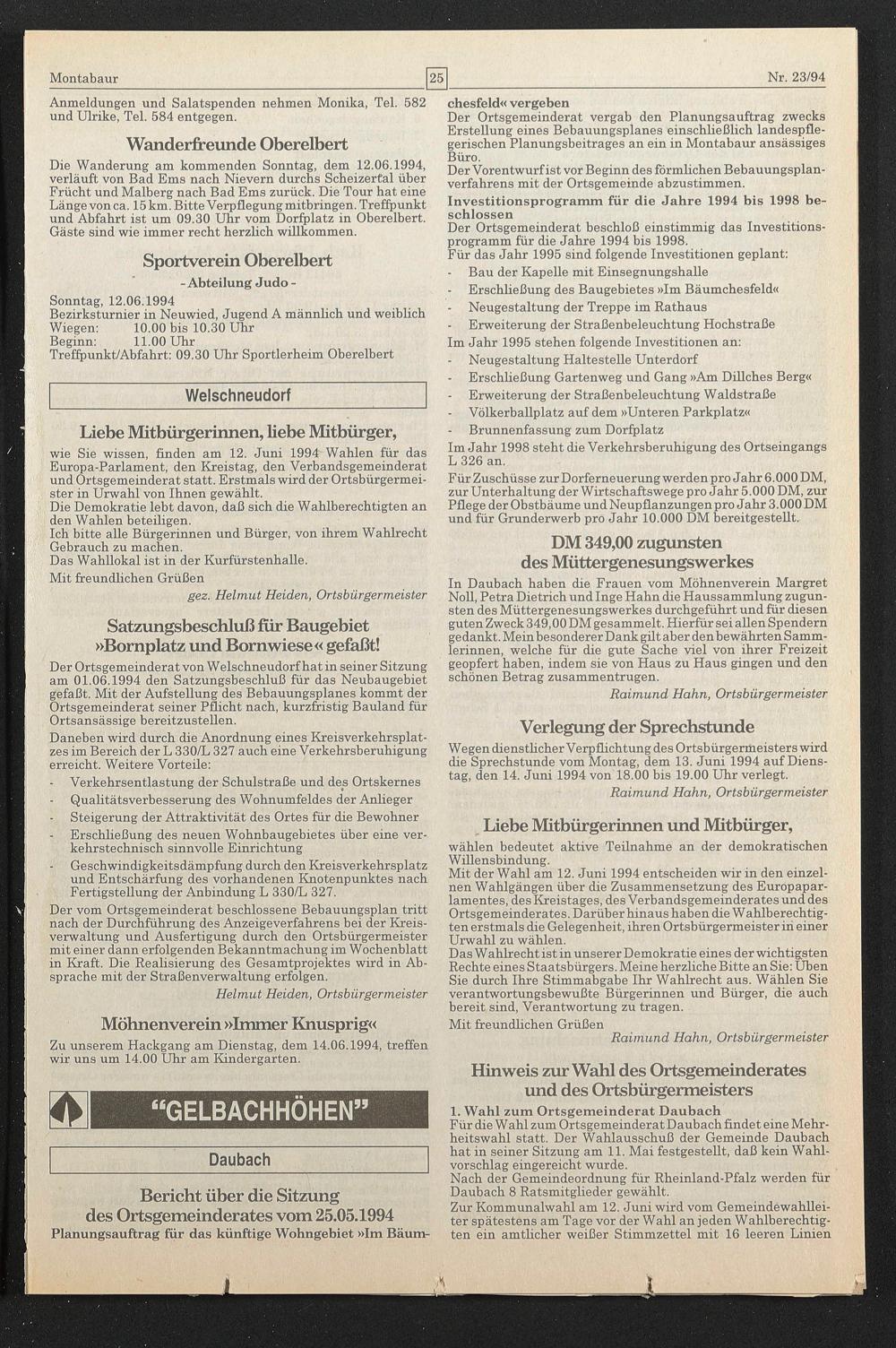 Bericht über die Sitzung des Ortsgemeinderates vom 25.05.1994