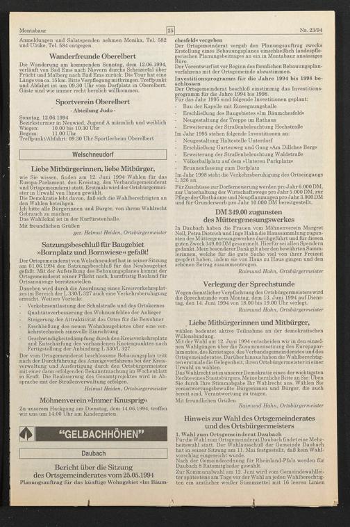 Mit der Wahl am 12. Juni 1994 entscheiden wir in den einzelnen Wahlgängen über die Zusammensetzung des Europaparlamentes, des Kreistages, des Verbandsgemeinderates und des Ortsgemeinderates. Darüber hinaus haben die Wahlberechtigten erstmals die Gelegenheit, ihren Ortsbürgermeister in einer Urwahl zu wählen.