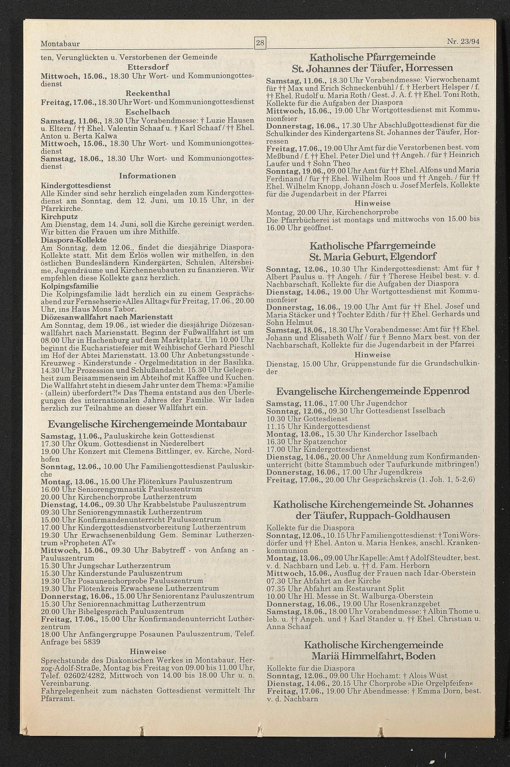 Sonntag, 12.06., 10.30 Uhr Kindergottesdienst: Amt für f Albert Paulus u. ff Angeh. / für f Therese Heibel best. v. d. Nachbarschaft, Kollekte für die Aufgaben der Diaspora Dienstag, 14.06., 19.00 Uhr Wortgottesdienst mit Kommunionfeier