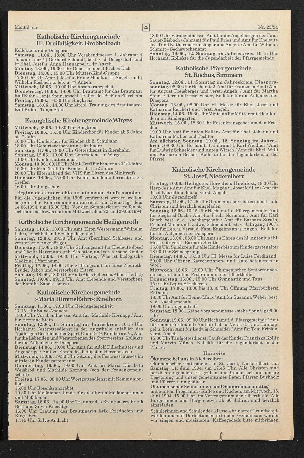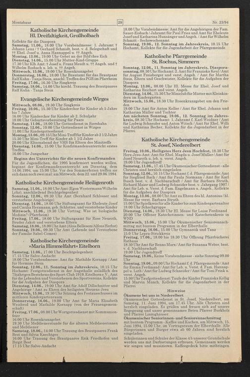 Ökumenischer Gottesdienst in St. Josef, Niederelbert, am Samstag, 11. Juni 1994, um 17.45 Uhr. Alle Christen sind herzbch eingeladen. Es grüßen und freuen sich auf unsere Begegnung und unser gemeinsames Beten Pfarrer Burkholz und Pfarrer Linnighäuser.