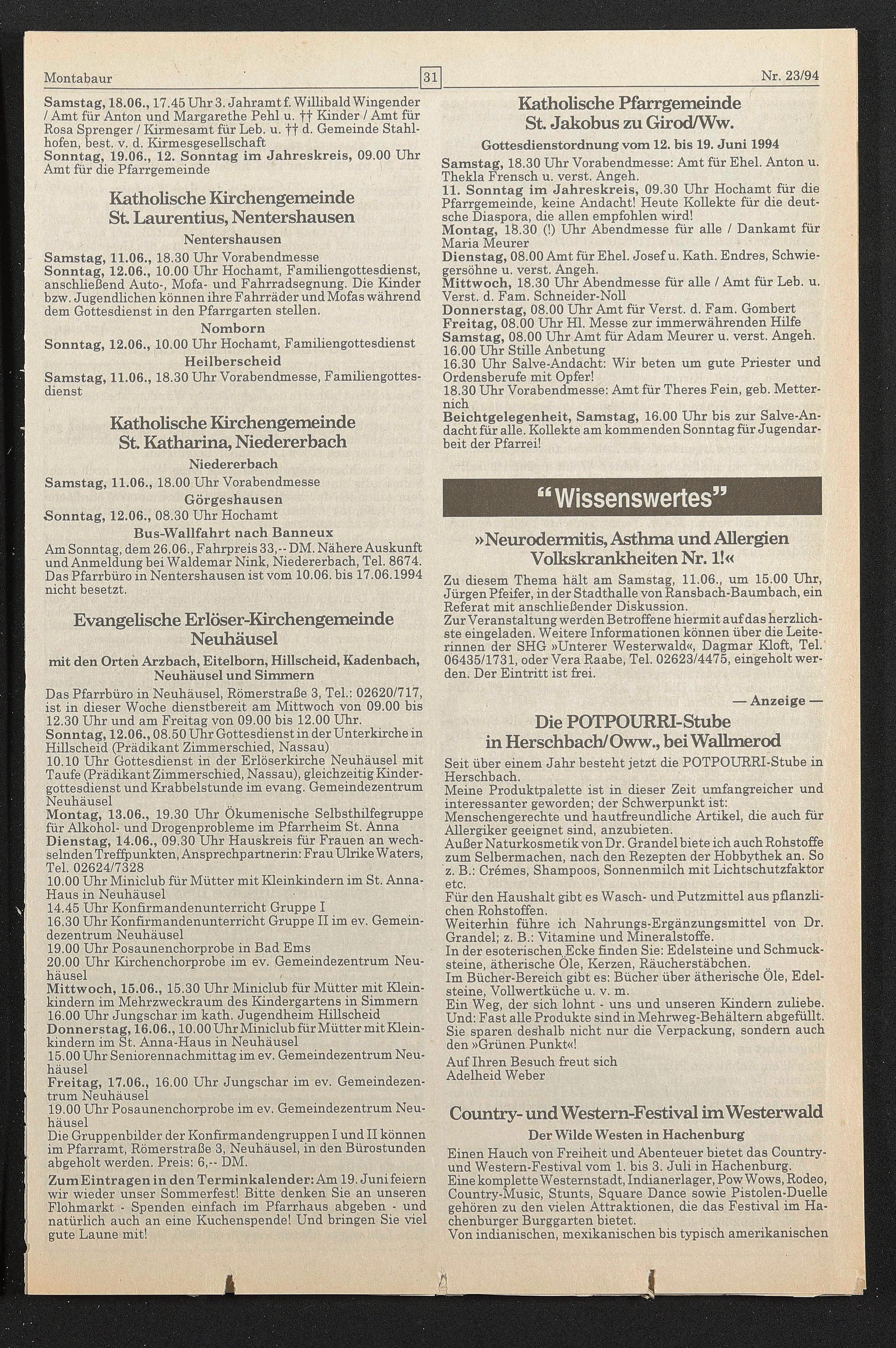 Bus-Wallfahrt nach Banneux Am Sonntag, dem 26.06., Fahrpreis 33,- DM. Nähere Auskunft und Anmeldung bei Waldemar Nink, Niedererbach, Tel. 8674. Das Pfarrbüro in Nentershausen ist vom 10.06. bis 17.06.1994 nicht besetzt.