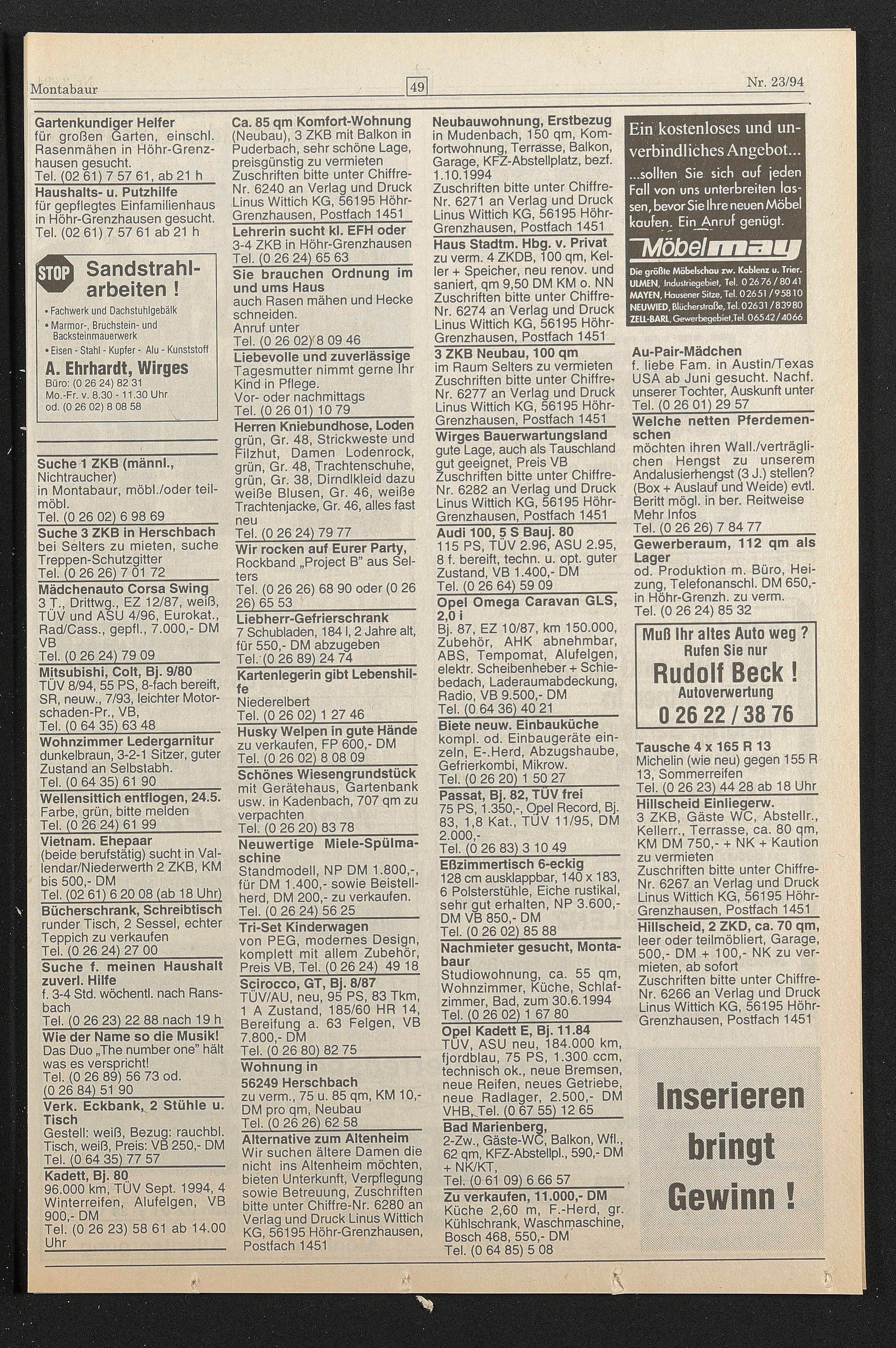 Zuschriften bitte unter Chiffre- Nr. 6271 an Verlag und Druck Linus Wittich KG, 56195 Höhr- Grenzhausen, Postfach 1451