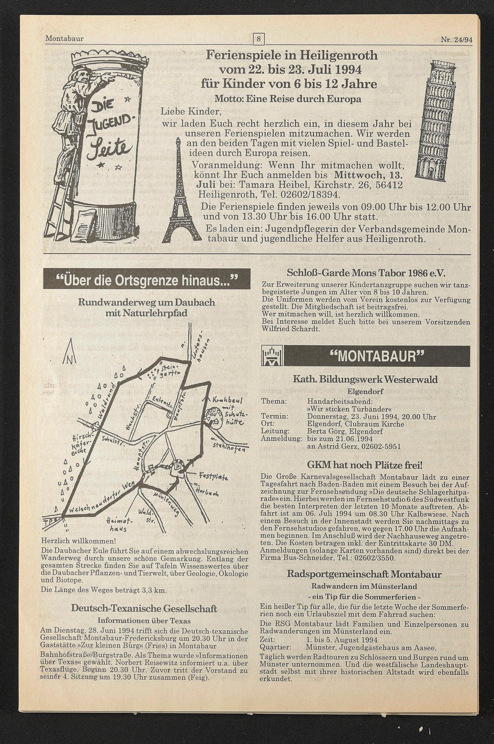 Am Dienstag, 28. Juni 1994 trifft sich die Deutsch-texanische Gesellschaft Montabaur-Fredericksburg um 20.30 Uhr in der Gaststätte »Zur kleinen Bürg« (Fries) in Montabaur Bahnhofstraße/Burgstraße. Als Thema wurde »Informationen über Texas« gewählt. Norbert Reisewitz informiert u.a. über Texäsflüge. Beginn 20.30 Uhr. Zuvor tritt der Vorstand zu seiner 4. Sitzung um 19.30 Uhr zusammen (Feig).