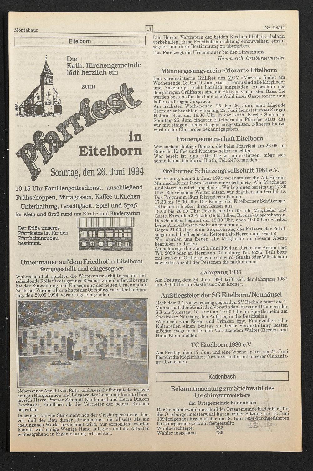 Der Gemeindewahlausschuß der Ortsgemeinde Kadenbach für die Ortsbürgermeisterwahl hat in seiner Sitzung am 13. Juni 1994 folgendes Ergebnis der am 12. Juni 19 94M urchgeführten Ortsbürgermeisterwahl festgestellt: ^