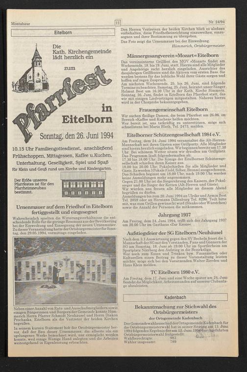 Am Freitag, dem 24. Juni 1994, trifft sich der Jahrgang 1937 um 20.00 Uhr im Gasthaus »Zur Krone«.