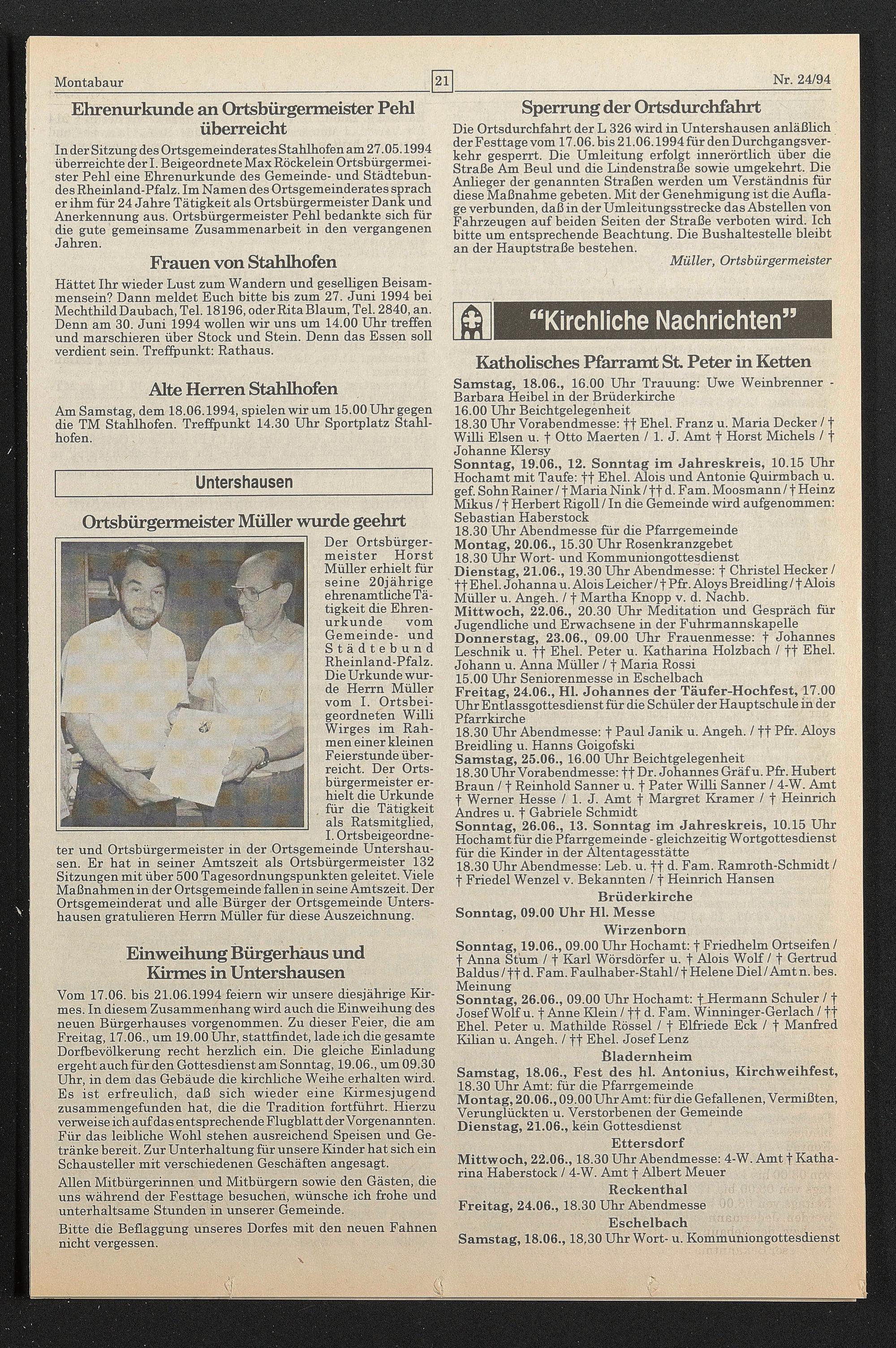 In der Sitzung des Ortsgemeinderates Stahlhofen am 27.05.1994 überreichte der I. Beigeordnete Max Röckelein Ortsbürgermeister Pehl eine Ehrenurkunde des Gemeinde- und Städtebundes Rheinland-Pfalz. Im Namen des Ortsgemeinderates sprach er ihm für 24 Jahre Tätigkeit als Ortsbürgermeister Dank und Anerkennung aus. Ortsbürgermeister Pehl bedankte sich für die gute gemeinsame Zusammenarbeit in den vergangenen Jahren.