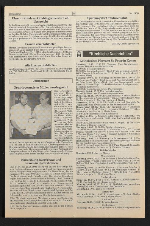 Vom 17.06. bis 21.06.1994 feiern wir unsere diesjährige Kirmes. In diesem Zusammenhang wird auch die Einweihung des neuen Bürgerhauses vorgenommen. Zu dieser Feier, die am Freitag, 17.06., um 19.00 Uhr, stattfindet, lade ich die gesamte Dorfbevölkerung recht herzlich ein. Die gleiche Einladung ergeht auch für den Gottesdienst am Sonntag, 19.06., um 09.30 Uhr, in dem das Gebäude die kirchliche Weihe erhalten wird. Es ist erfreulich, daß sich wieder eine Kirmesjugend zusammengefunden hat, die die Tradition fortführt. Hierzu verweise ich auf das entsprechende Flugblatt der Vorgenannten. Für das leibliche Wohl stehen ausreichend Speisen und Getränke bereit. Zur Unterhaltung für unsere Kinder hat sich ein Schausteller mit verschiedenen Geschäften angesagt.