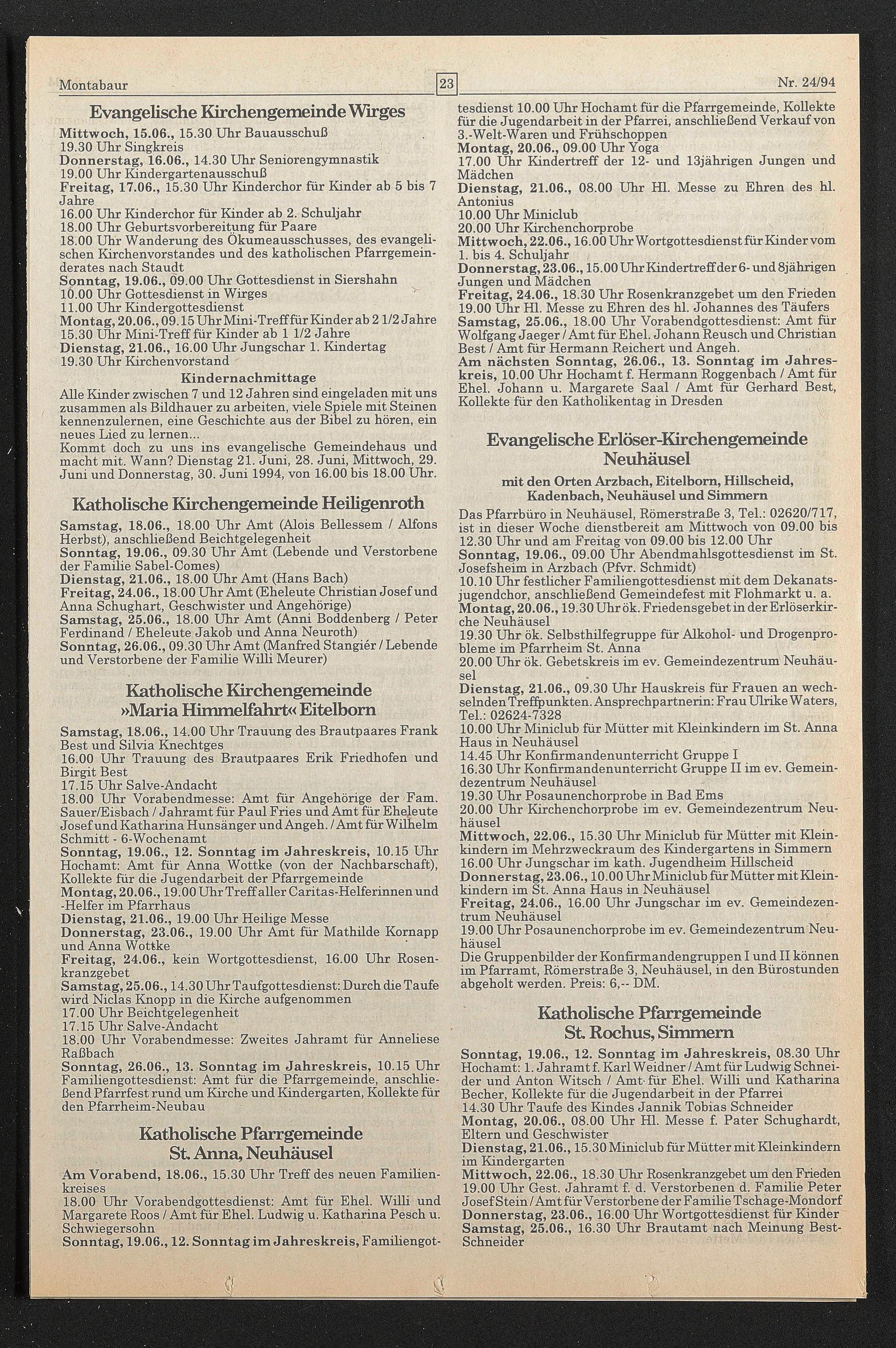 Sonntag, 19.06., 12. Sonntag im Jahreskreis, 08.30 Uhr Hochamt: 1. Jahramt f. Karl Weidner / Amt für Ludwig Schneider und Anton Witsch / Amt- für Ehel. Willi und Katharina Becher, Kollekte für die Jugendarbeit in der Pfarrei