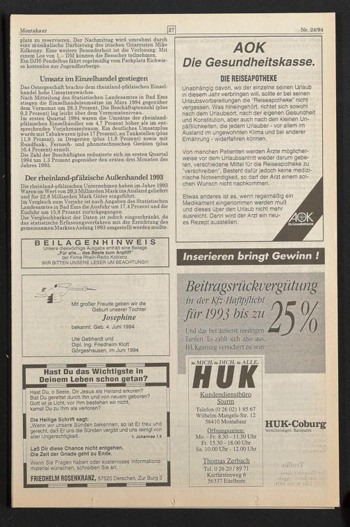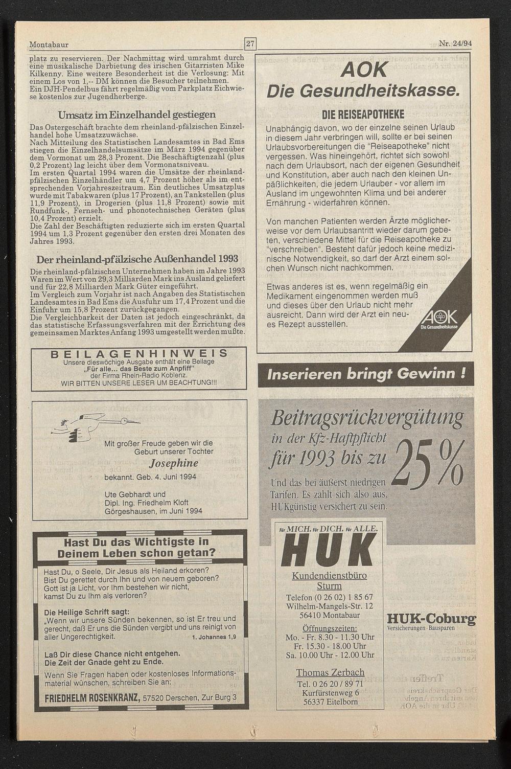 Nach Mitteilung des Statistischen Landesamtes in Bad Ems stiegen die Einzelhandelsumsätze im März 1994 gegenüber dem Vormonat um 28,3 Prozent. Die Beschäftigtenzahl (plus 0,2 Prozent) lag leicht über dem Vormonatsniveau.