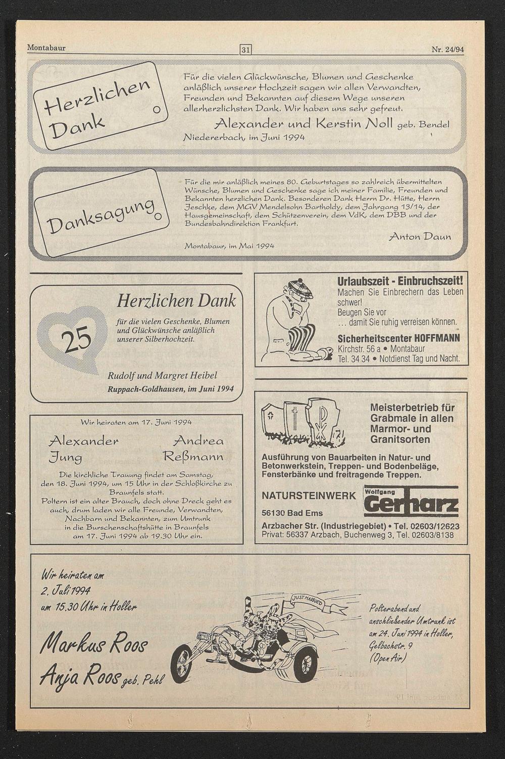 Die kirchliche "Ürauurg findet am Samstag, den "18. H uni 1994/ um 15 LAhr in der Schloßkirche zu Braunfels statt.