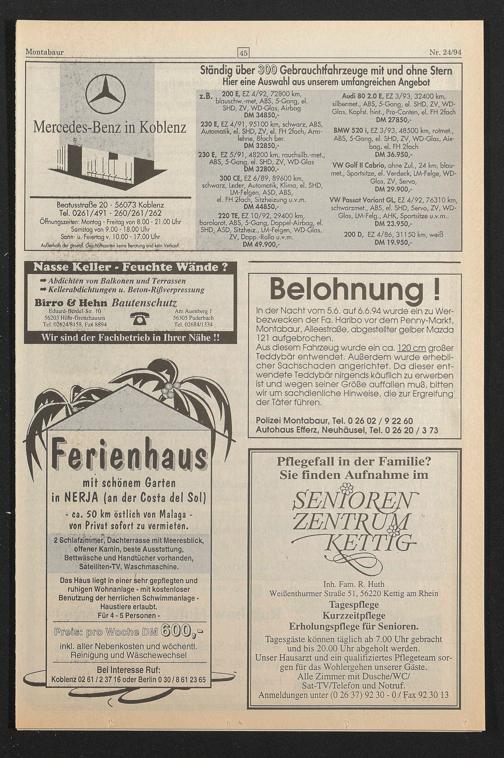 ln der Nacht vom 5.6. auf 6.6.94 wurde ein zu Werbezwecken der Fa. Haribo vor dem Penny-Markt, Montabaur, Alleestraße, abgestellter gelber Mazda 121 aufgebrochen.