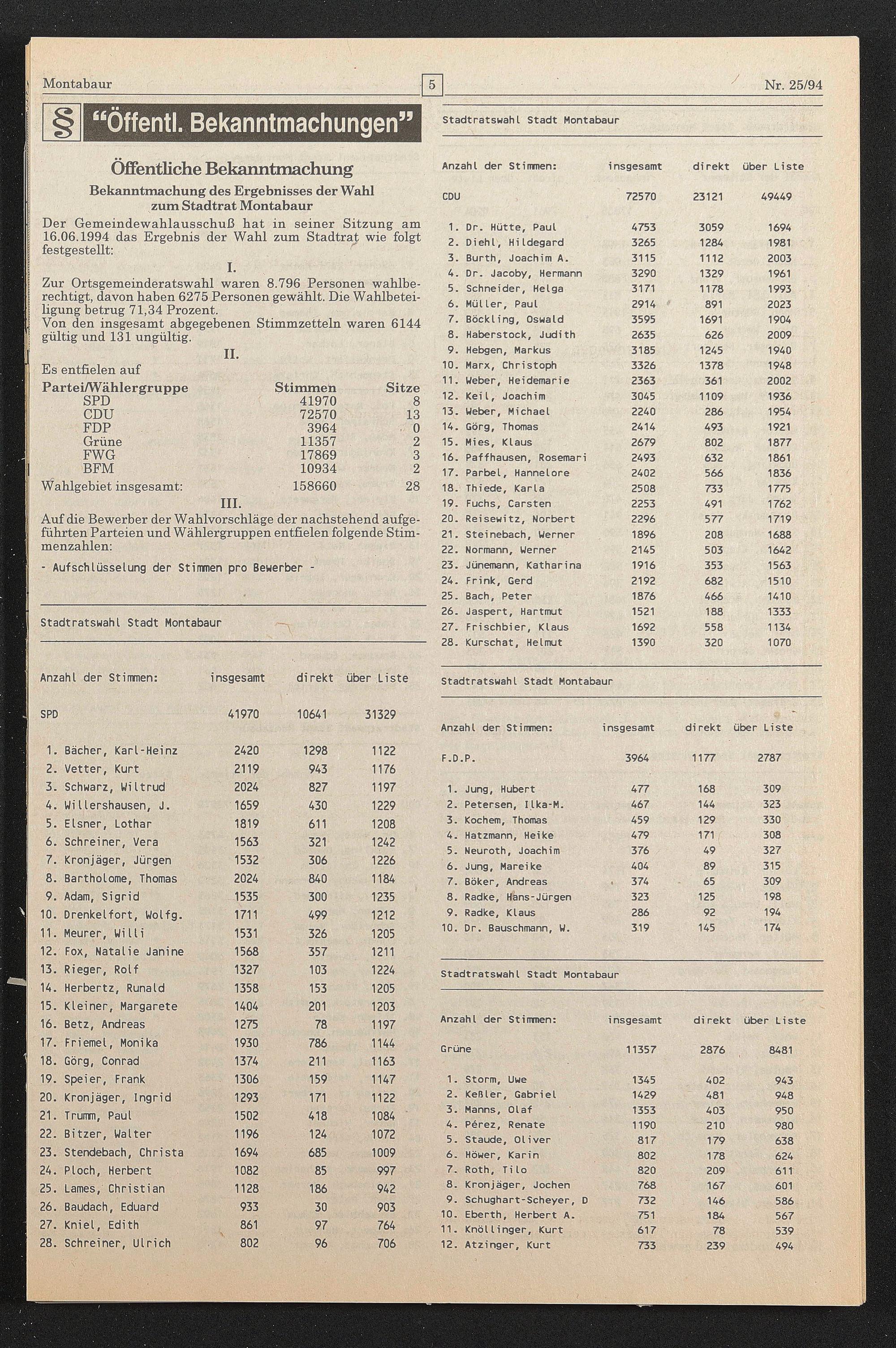 Der Gemeindewahlausschuß hat in seiner Sitzung am 16.06.1994 das Ergebnis der Wahl zum Stadtrat wie folgt festgestellt: