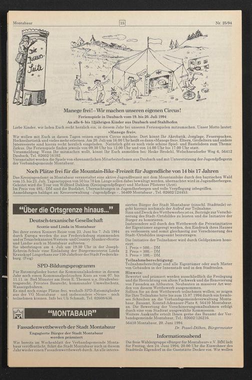 Die freie Wählergruppe »Bürger für Montabaur« e.V. BfM lädt für Freitag, den 24. Juni 1994, 20.00 Uhr die Einwohner des Stadtteils Eigendorf in die Gaststätte Decker ein. Wir wollen