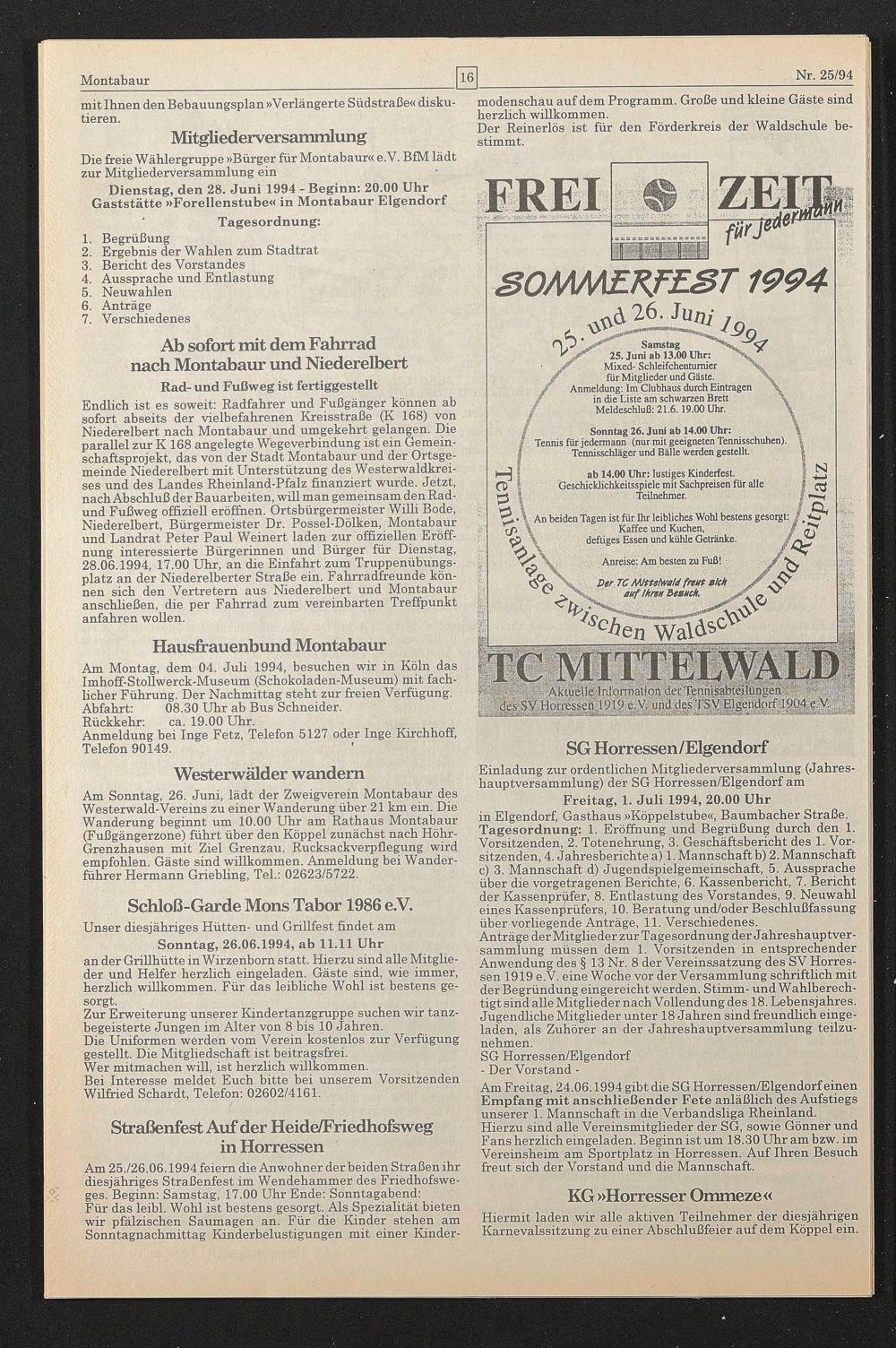 Am 25./26.06.1994 feiern die Anwohner der beiden Straßen ihr diesjähriges Straßenfest im Wendehammer des Friedhofsweges. Beginn: Samstag, 17.00 Uhr Ende: Sonntagabend: