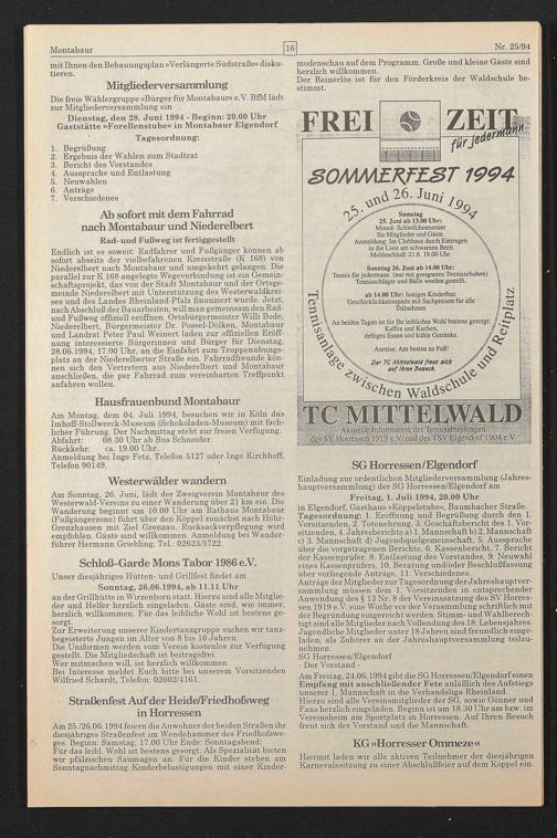 Einladung zur ordentlichen Mitgliederversammlung (Jahreshauptversammlung) der SG Horressen/Elgendorf am Freitag, 1. Juli 1994, 20.00 Uhr in Eigendorf, Gasthaus »Köppelstube«, Baumbacher Straße. Tagesordnung: 1. Eröffnung und Begrüßung durch den 1. Vorsitzenden, 2. Totenehrung, 3. Geschäftsbericht des 1. Vorsitzenden, 4. Jahresberichte a) 1. Mannschaft b) 2. Mannschaft c) 3. Mannschaft d) Jugendspielgemeinschäft, 5. Aussprache über die vorgetragenen Berichte, 6. Kassenbericht, 7. Bericht der Kassenprüfer, 8. Entlastung des Vorstandes, 9. Neuwahl eines Kassenprüfers, 10. Beratung und/oder Beschlußfassung über vorliegende Anträge, 11. Verschiedenes.