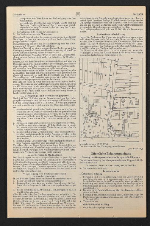 aller Grundstücke des Umlegungsgebietes aufgeführt. Die Bestandskarte und das Bestandsverzeichnis, mit Ausnahme der im Grundbuch in Abteilung II eingetragenen Lasten uhd Beschränkungen, liegen in der Zeit vom 04.07.1994 bis 03.08.1994 bei der Verbandsgemeindeverwaltung Montabaur, Zimmer 203, während der Dienststunden öffentlich aus. In die im Satz 1 unter lfd. Nr. 3 bezeichneten Teile des Bestandsver