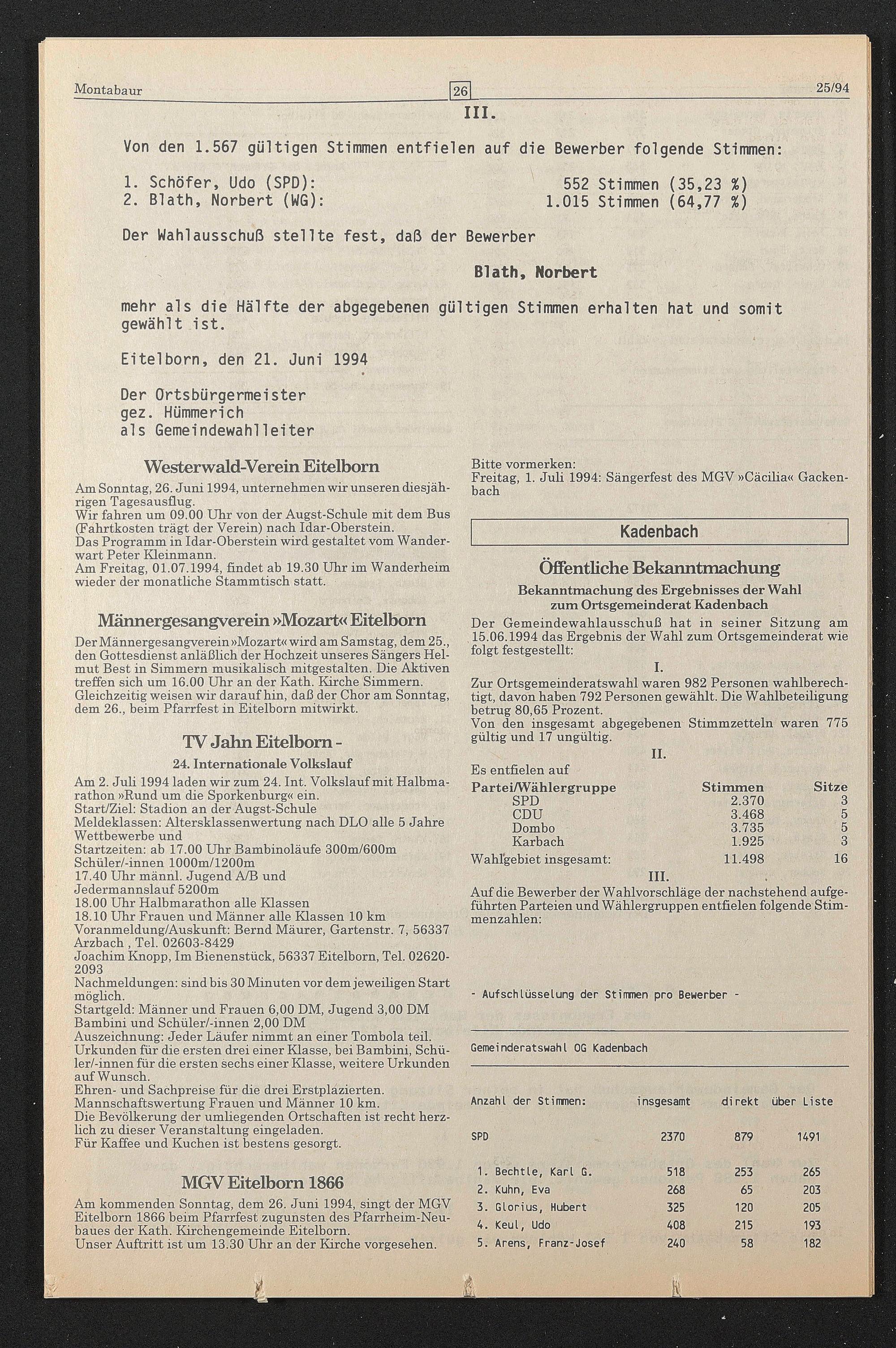 Bekanntmachung des Ergebnisses der Wahl zum Ortsgemeinderat Kadenbach Der Gemeindewahlausschuß hat in seiner Sitzung am , 15.06.1994 das Ergebnis der Wahl zum Ortsgemeinderat wie folgt festgestellt: