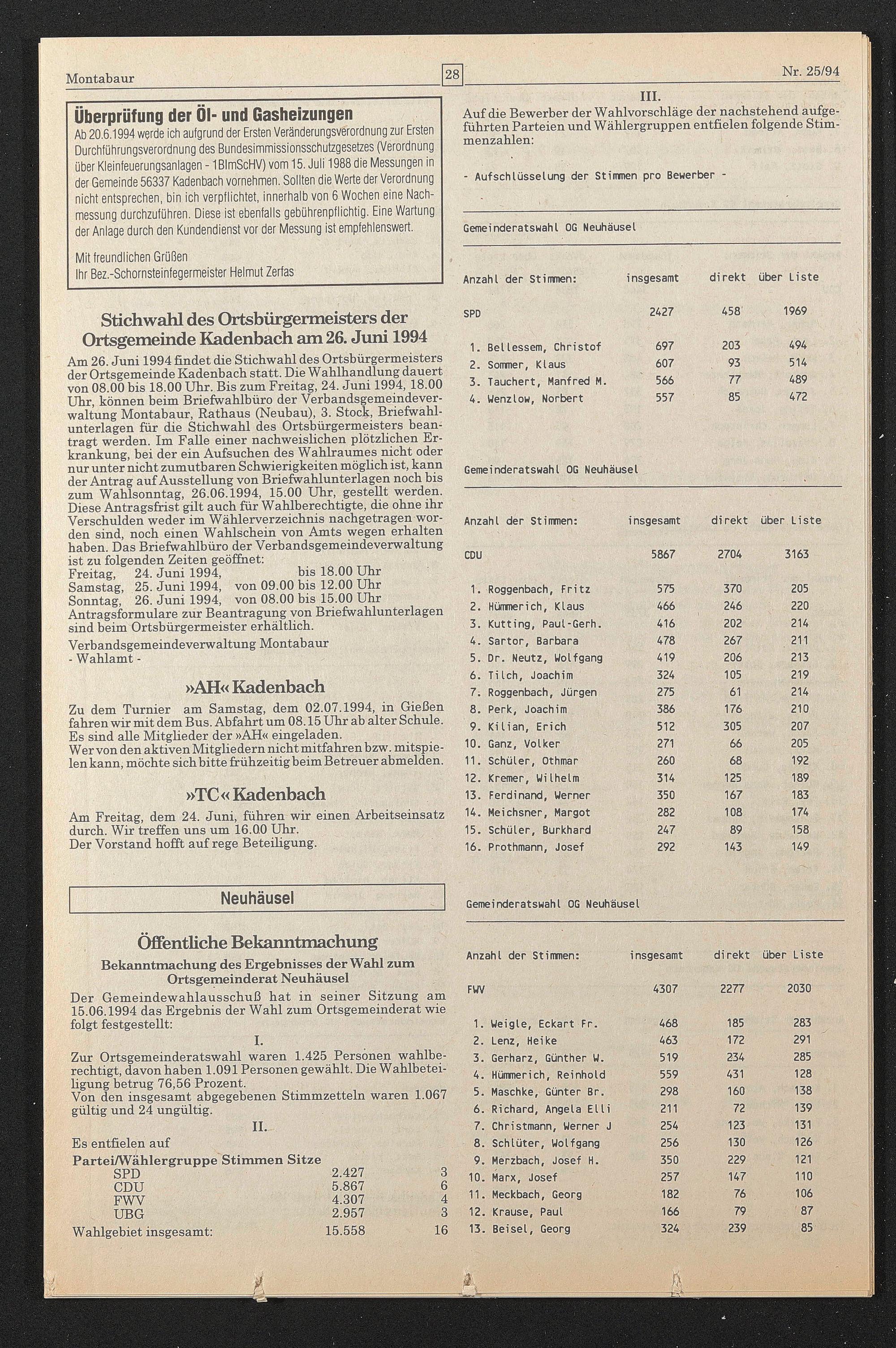Stichwahl des Ortsbürgermeisters der Ortsgemeinde Kadenbach am 26. Juni 1994
