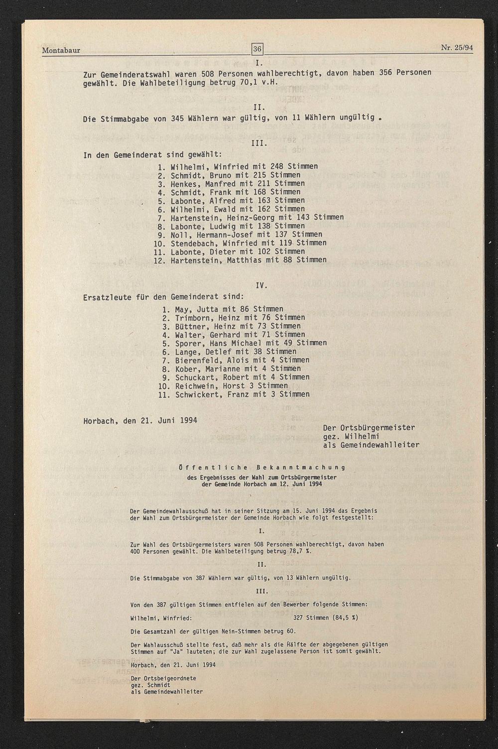 des Ergebnisses der Wahl zum Ortsbürgermeister der Gemeinde Horbach am 12. Juni 1994