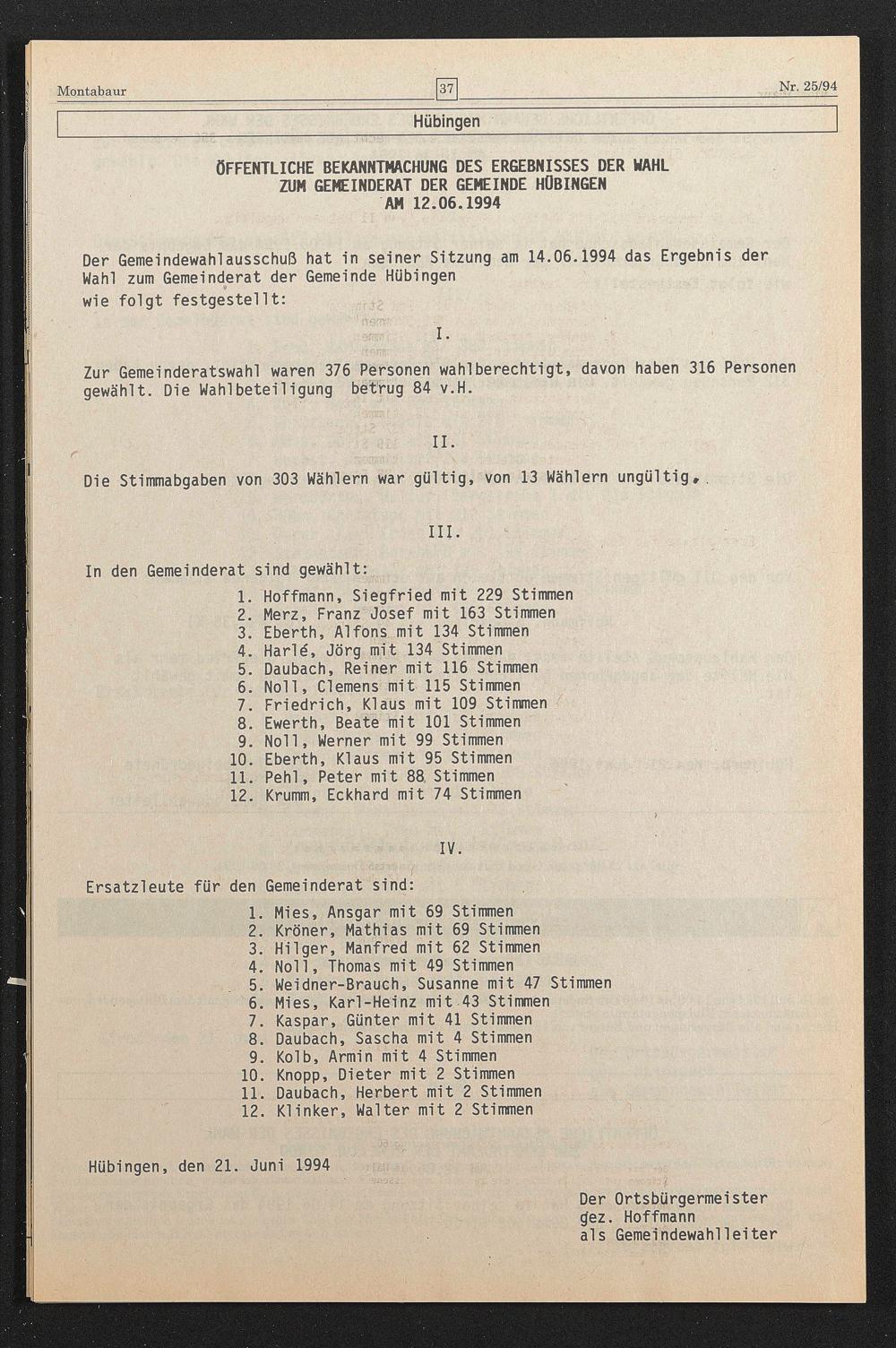 Der Gemeindewahlausschuß hat in seiner Sitzung am 14.06.1994 das Ergebnis der Wahl zum Gemeinderat der Gemeinde Hübingen