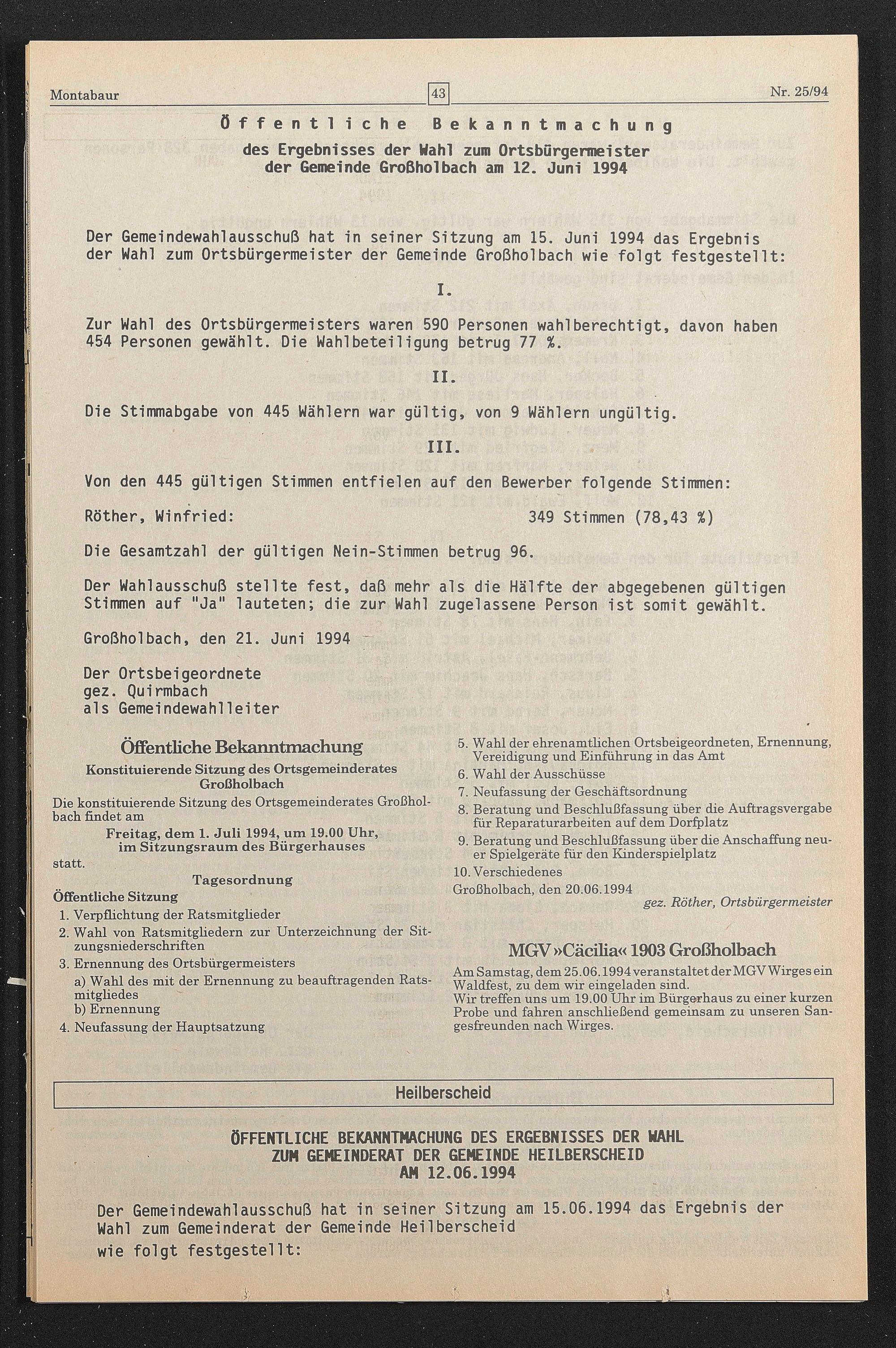 des Ergebnisses der Wahl zum Ortsburgermeister der Gemeinde Großholbach am 12. Juni 1994