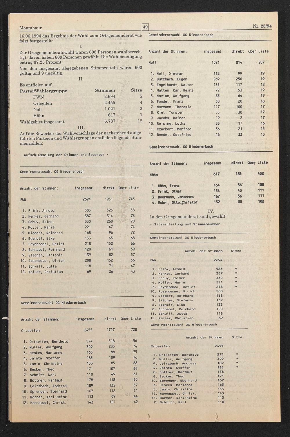 16.06.1994 das Ergebnis der Wahl zum Ortsgemeinderat wie Gerneinderatswahl OG Niedererbach folgt festgestellt: -