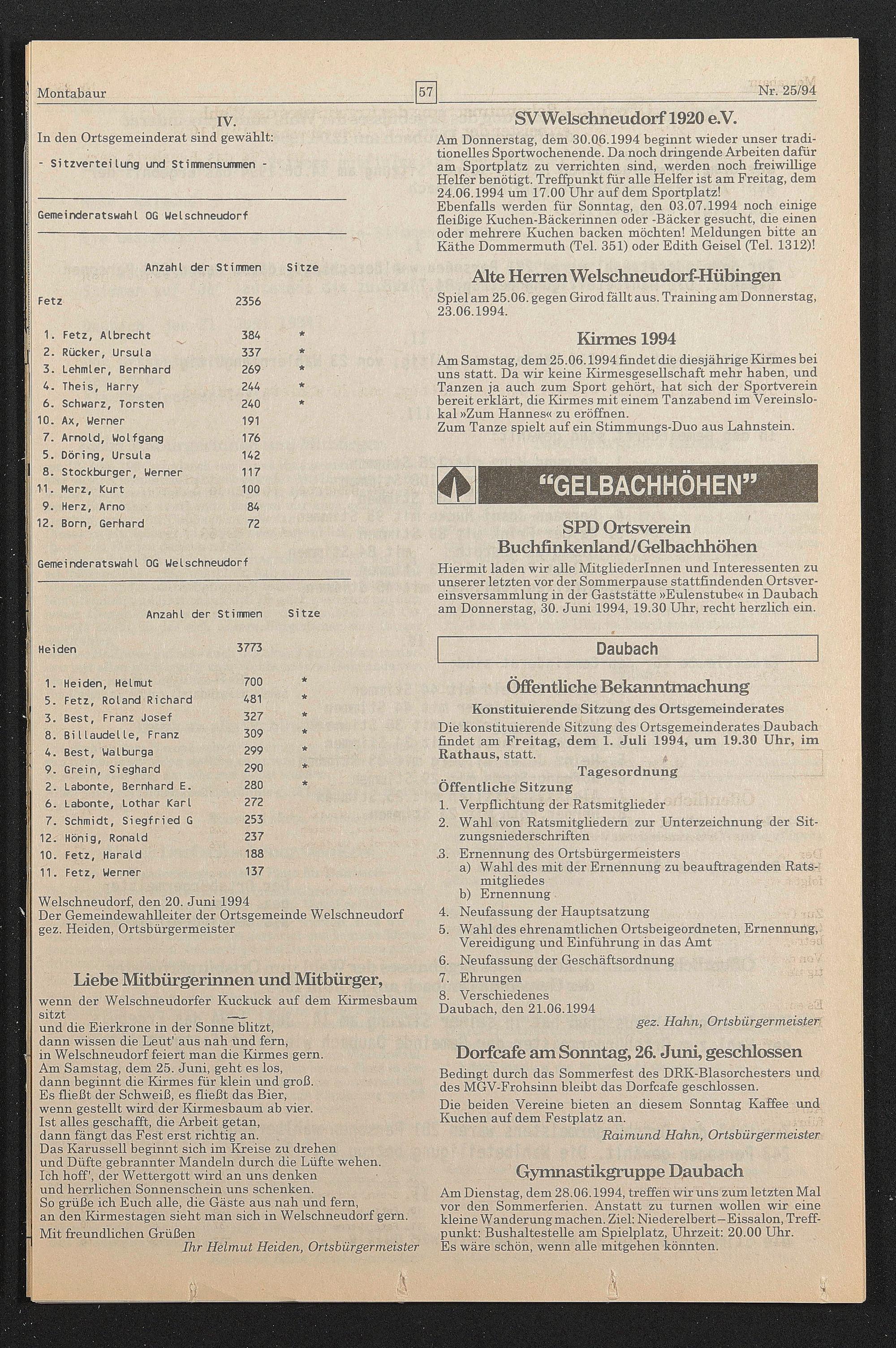 Hiermit laden wir alle Mitgliederlnnen und Interessenten zu unserer letzten vor der Sommerpause stattfindenden Ortsvereinsversammlung in der Gaststätte »Eulenstube« in Daubach am Donnerstag, 30. Juni 1994, 19.30 Uhr, recht herzlich ein.
