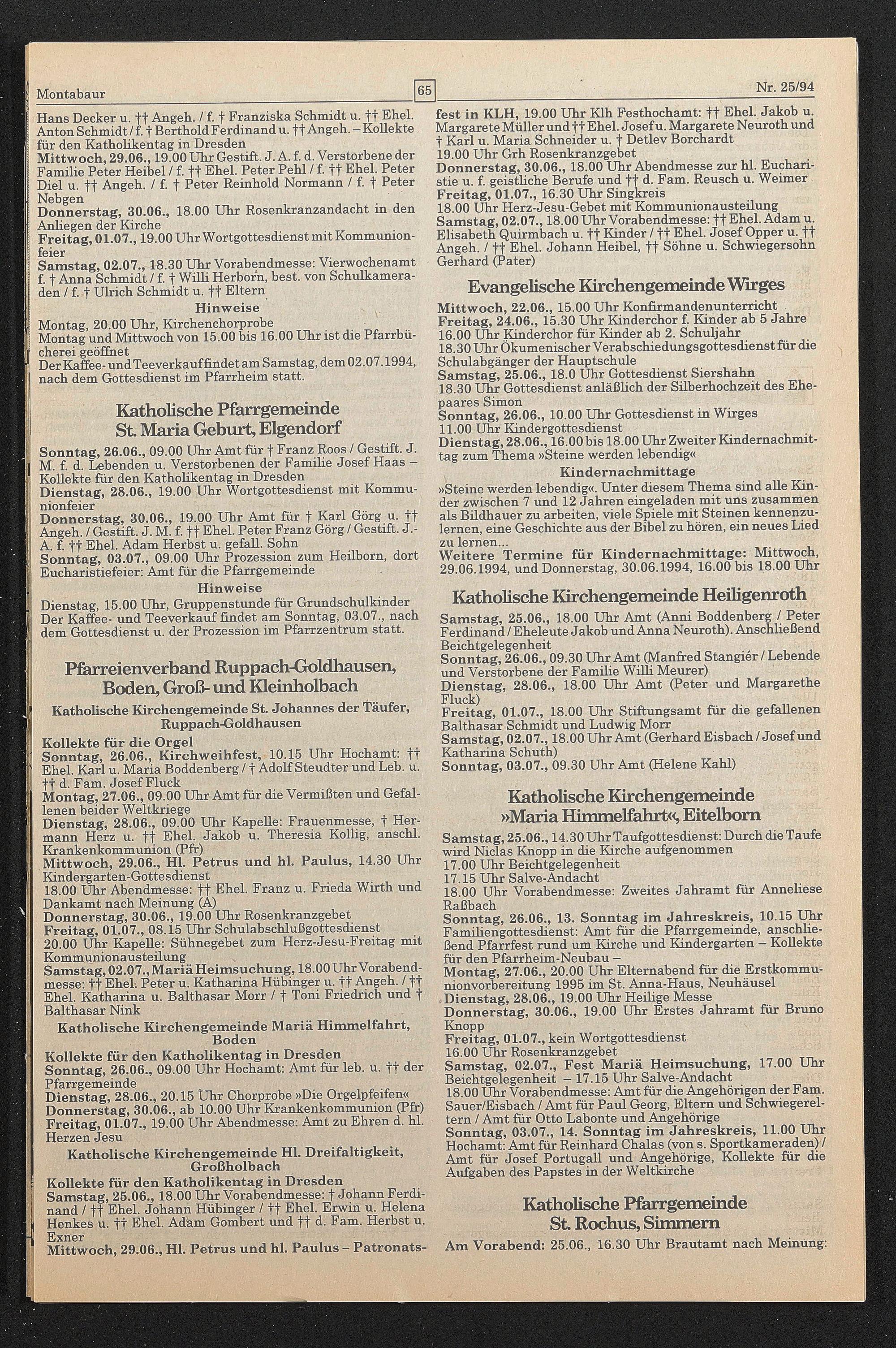 Samstag, 25.06., 18.00 Uhr Amt (Anni Boddenberg / Peter Ferdinand / Eheleute Jakob und Anna Neuroth). Anschließend Beichtgelegenheit