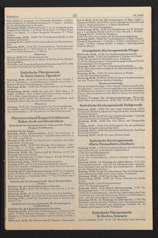 Kollekte für den Katholikentag in Dresden Samstag, 25.06., 18.00 Uhr Vorabendmesse: f Johann Ferdinand / ff Ehel. Johann Hübinger / ft Ehel. Erwin u. Helena Henkes u. ft Ehel. Adam Gombert und ff d. Farn. Herbst u. Exner