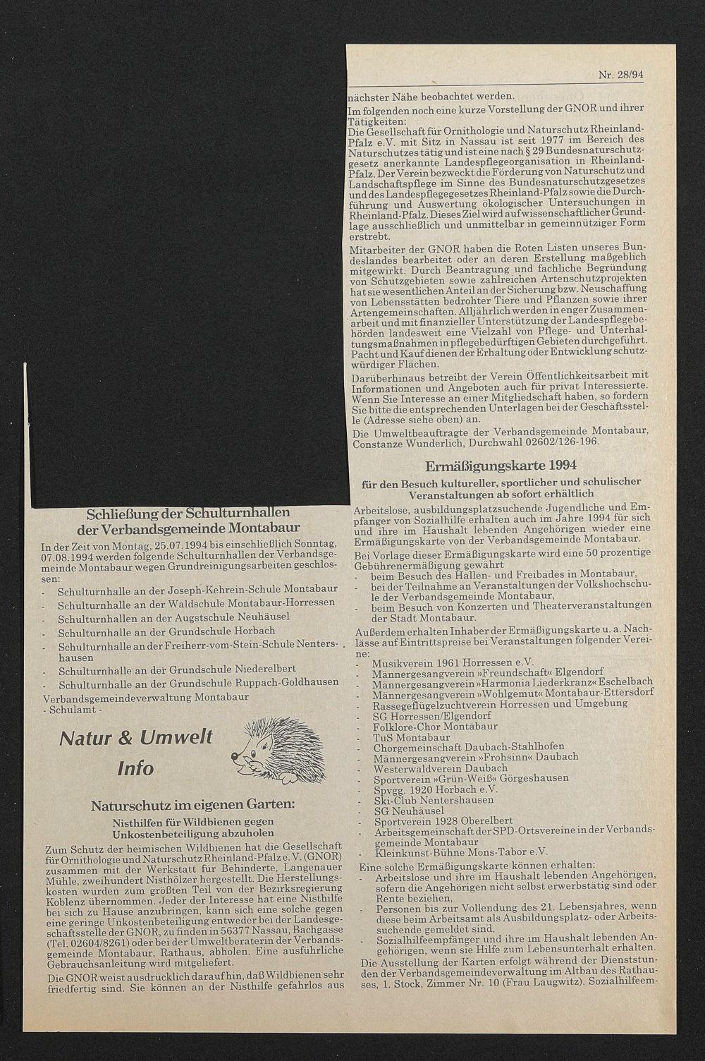 In der Zeit von Montag, 25.07.1994 bis einschließlich Sonntag, 07.08.1994 werden folgende Schulturnhallen der Verbandsgemeinde Montabaur wegen Grundreinigungsarbeiten geschlossen: