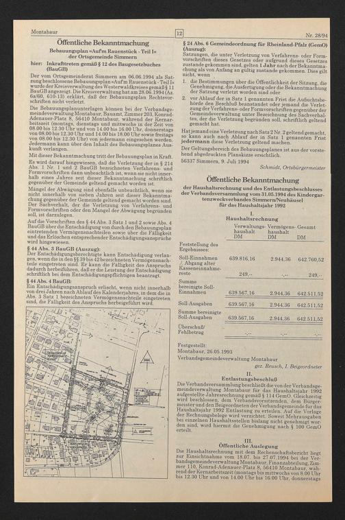 Die Haushaltsrechnung mit dem Rechenschaftsbericht liegt zur Einsichtnahme vom 18.07. bis 27.07.1994 bei der Verbandsgemeindeverwaltung Montabaur, Finanzabteilung, Zimmer 110, Konrad-Adenauer-Platz 8, 56410 Montabaur, während der Kernarbeitszeit (montags bis mittwochs von 8.00 Uhr bis 12.30 Uhr und von 14.00 Uhr bis 16.00 Uhr, donnerstags