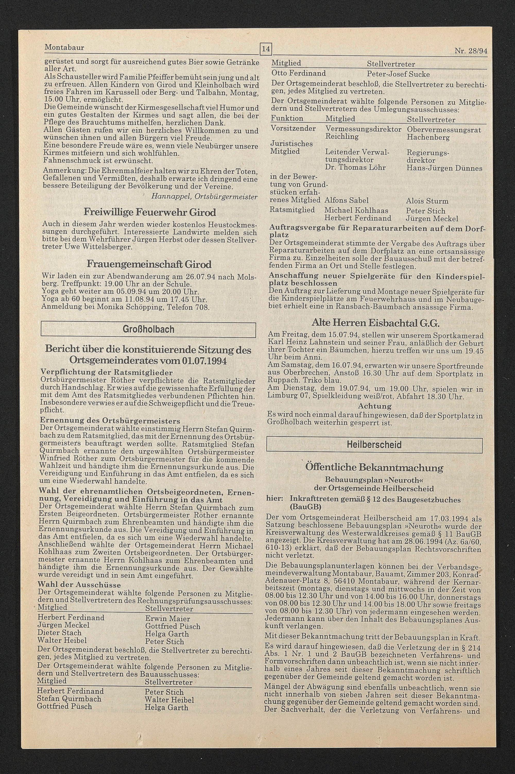 Bericht über die konstituierende Sitzung des Ortsgemeinderates vom 01.07.1994