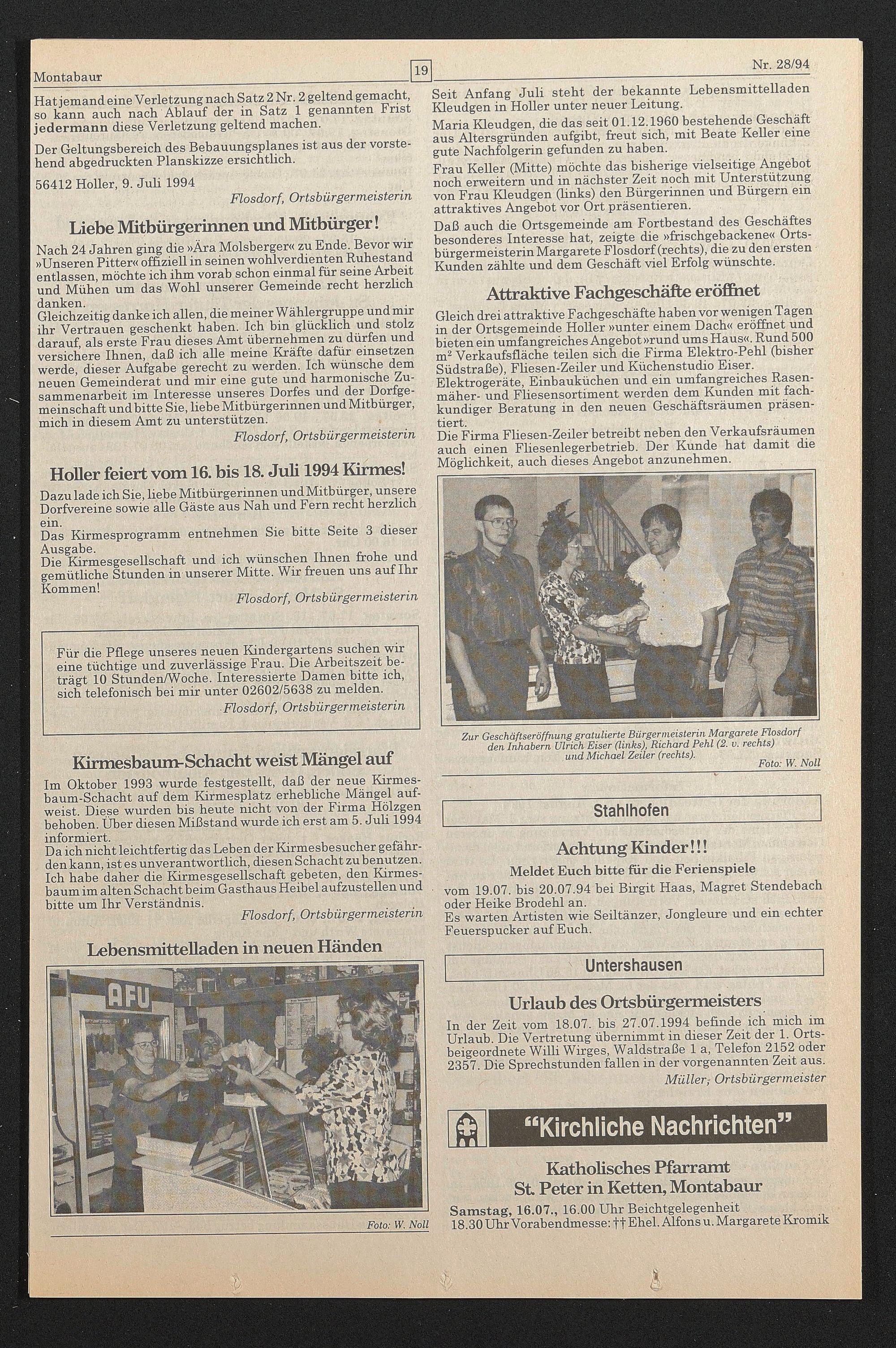 In der Zeit vom 18.07. bis 27.07.1994 befinde ich mich im Urlaub. Die Vertretung übernimmt in dieser Zeit der 1. Ortsbeigeordnete Willi Wirges, Waldstraße 1 a, Telefon 2152 oder 2357. Die Sprechstunden fallen in der vorgenannten Zeit aus.