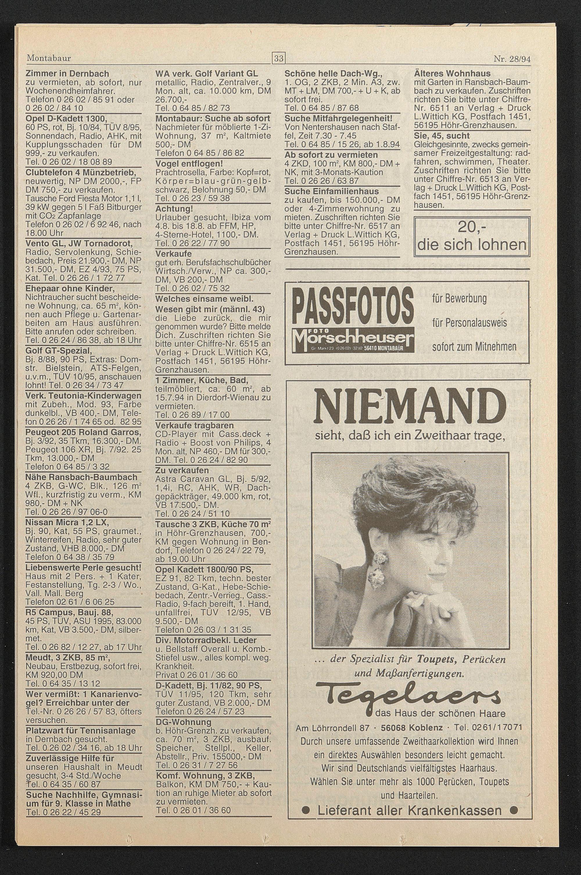 Suche Mitfährgelegenheit! Von Nentershausen nach Staffel, Zeit 7.30 - 7.45 Tel. 0 64 85 /15 26, ab 1.8.94 Ab sofort zu vermieten 4 ZKD, 100 m 2 , KM 800,- DM + NK, mit 3-Monats-Kaution Tel. 0 26 26 / 63 87 _