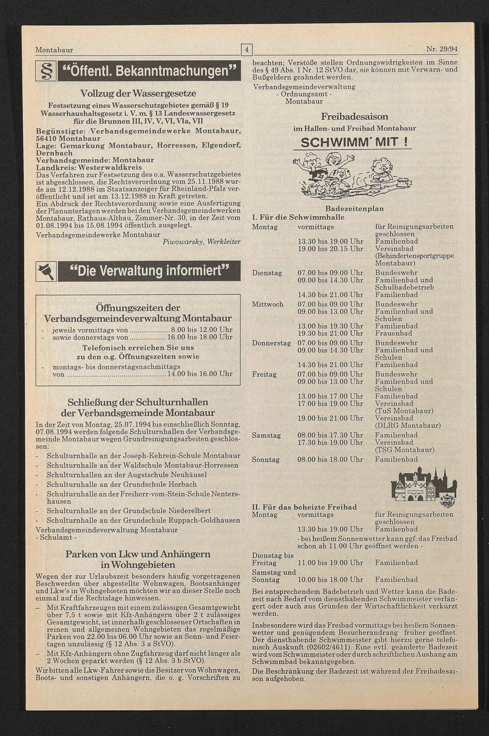 In der Zeit von Montag, 25.07.1994 bis einschheßlich Sonntag, 07.08.1994 werden folgende Schulturnhallen der Verbandsgemeinde Montabaur wegen Grundreinigungsarbeiten geschlossen: