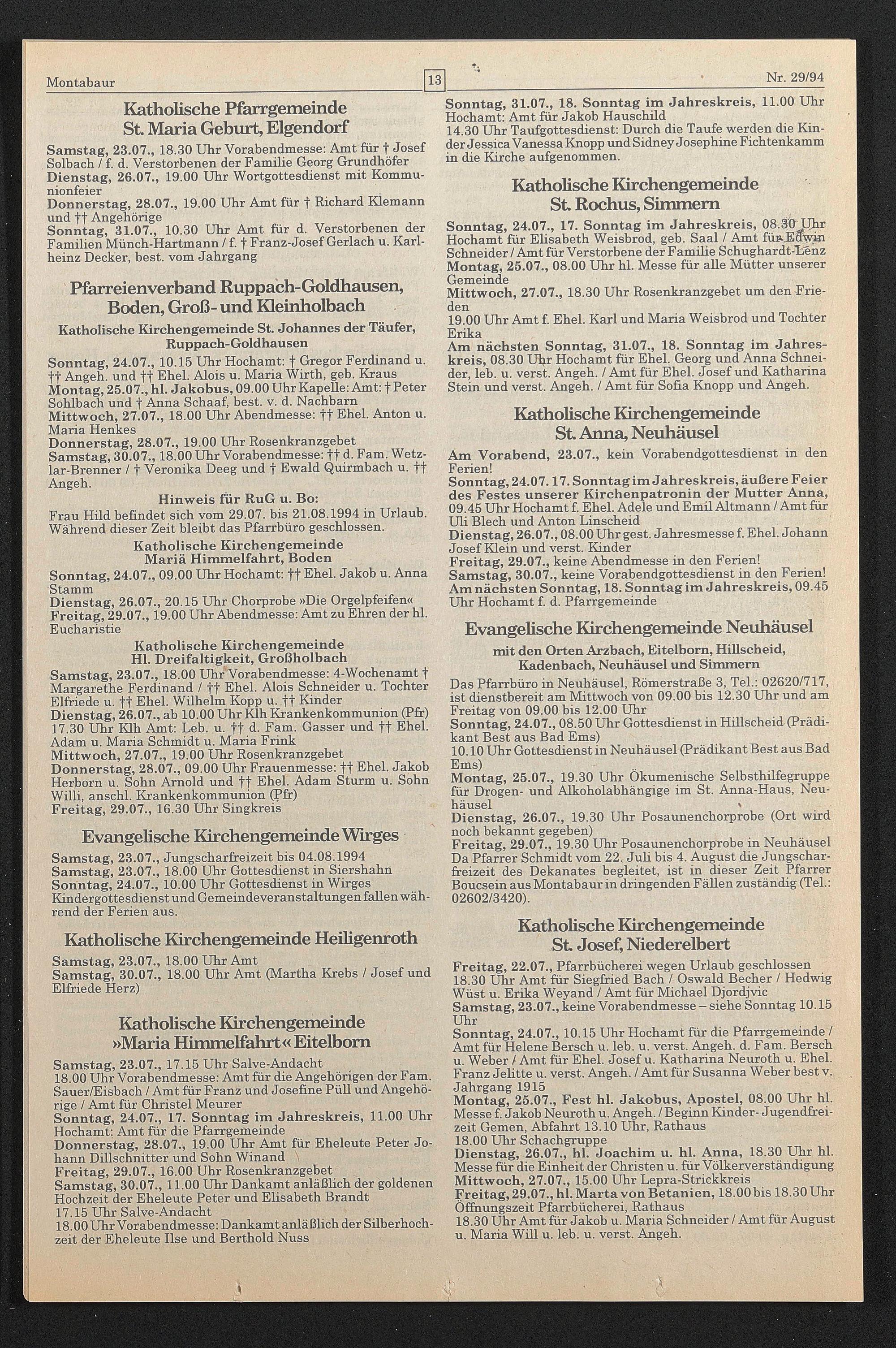 Samstag, 23.07., Jungscharfreizeit bis 04.08.1994 Samstag, 23.07., 18.00 Uhr Gottesdienst in Siershahn Sonntag, 24.07., 10.00 Uhr Gottesdienst in Wirges Kindergottesdienst und Gemeindeveranstaltungen fallen während der Ferien aus.