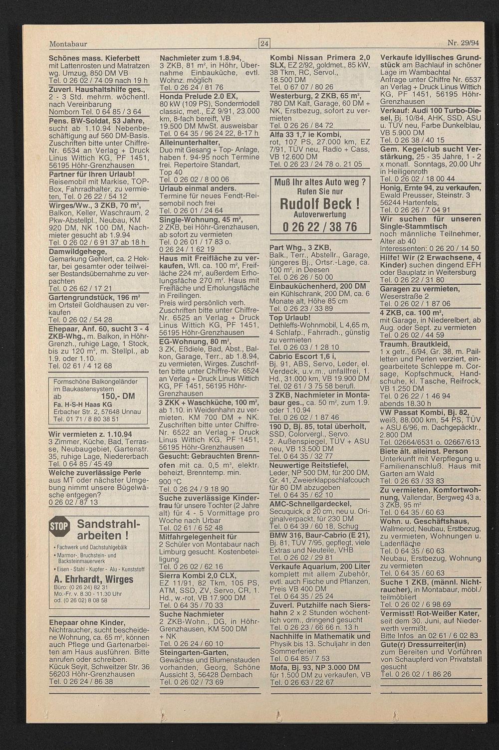 Wirges/Ww., 3 ZKB, 70 m * 2 , Balkon, Keller, Waschraum, 2 Pkw-Abstellpl., Neubau, KM 920 DM, NK 100 DM, Nachmieter gesucht ab 1.9.94 Tel. 0 26 02/6 91 37 ab 18 h