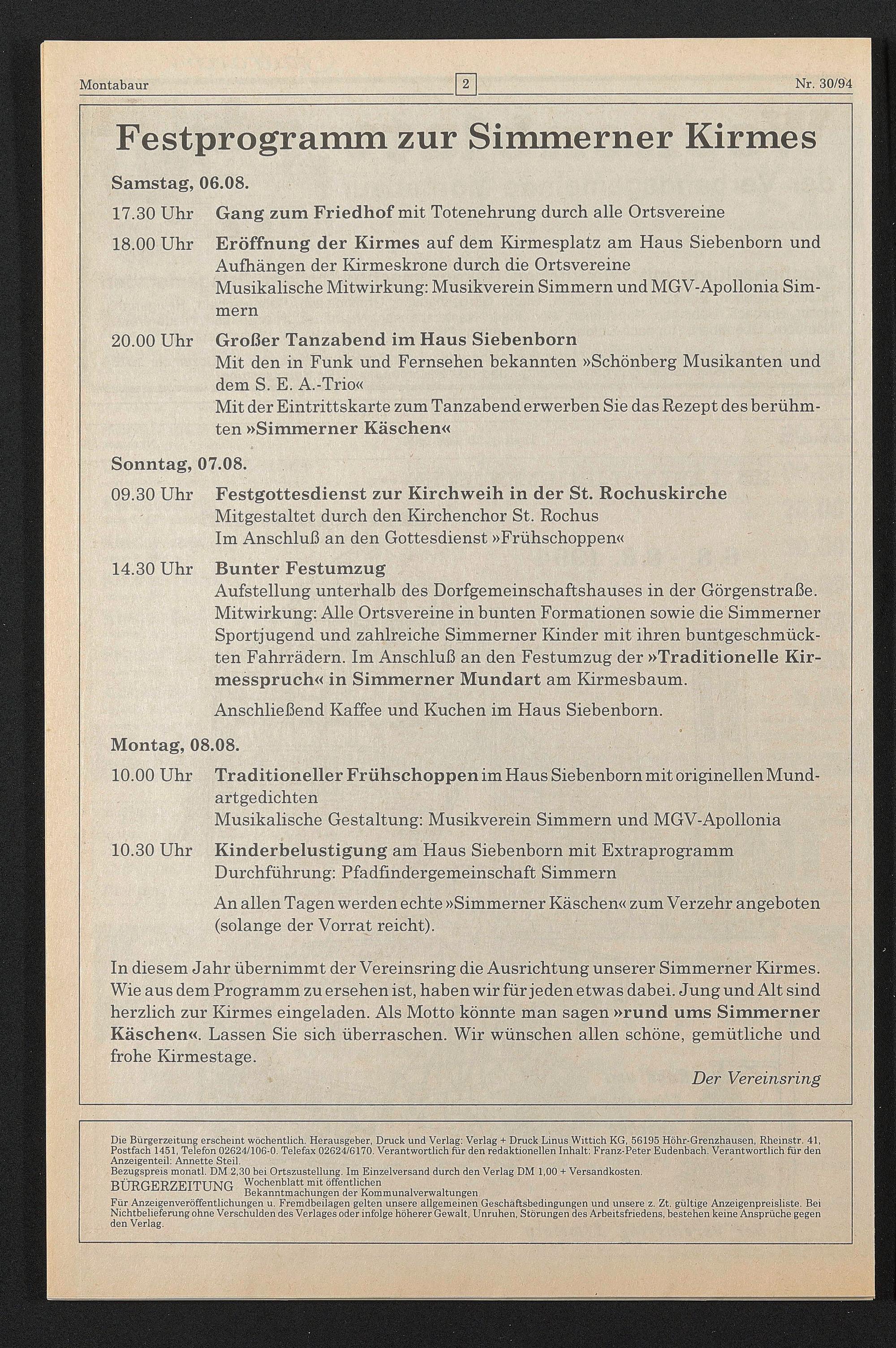 Die Bürgerzeitung erscheint wöchentlich. Herausgeber, Druck und Verlag: Verlag + Druck Linus Wittich KG, 56195 Höhr-Grenzhausen, Rheinstr. 41, Postfach 1451, Telefon 02624/106-0. Telefax 02624/6170. Verantwortlich für den redaktionellen Inhalt: Franz-Peter Eudenbach. Verantwortlich für den Anzeigenteil: Annette Steil. '