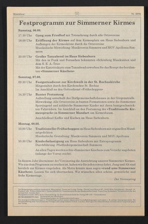Festprogramm zur Simmerner Kirmes