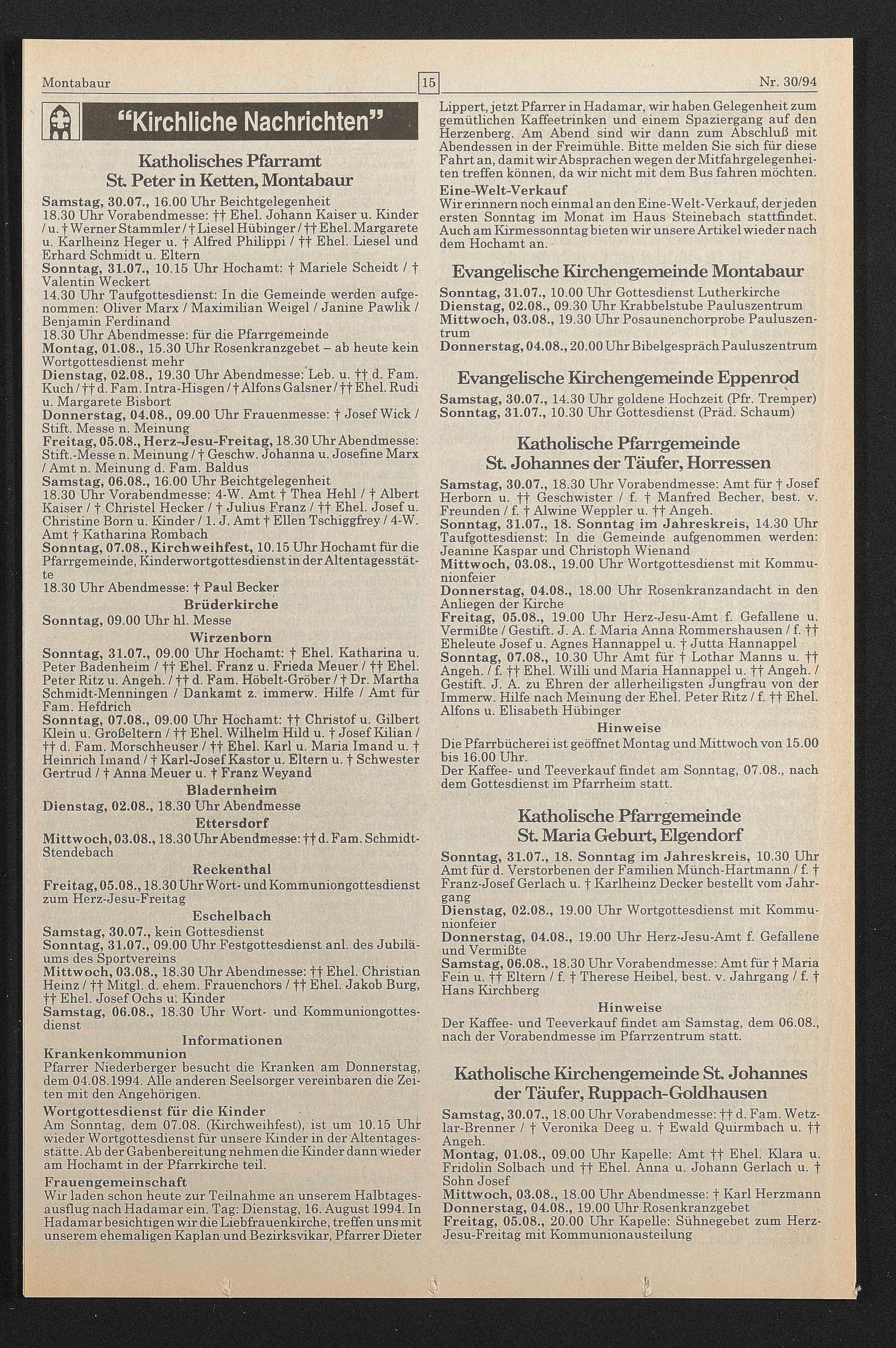 Sonntag, 07.08., 09.00 Uhr Hochamt: ft Christof u. Gilbert Klein u. Großeltern / ff Ehel. Wilhelm Hild u. f Josef Kilian / ff d. Farn. Morschheuser / ff Ehel. Karl u. Maria Imand u. f Heinrich Imand / f Karl-Josef Kastor u. Eltern u. f Schwester Gertrud / f Anna Meuer u. f Franz Weyand Bladernheim