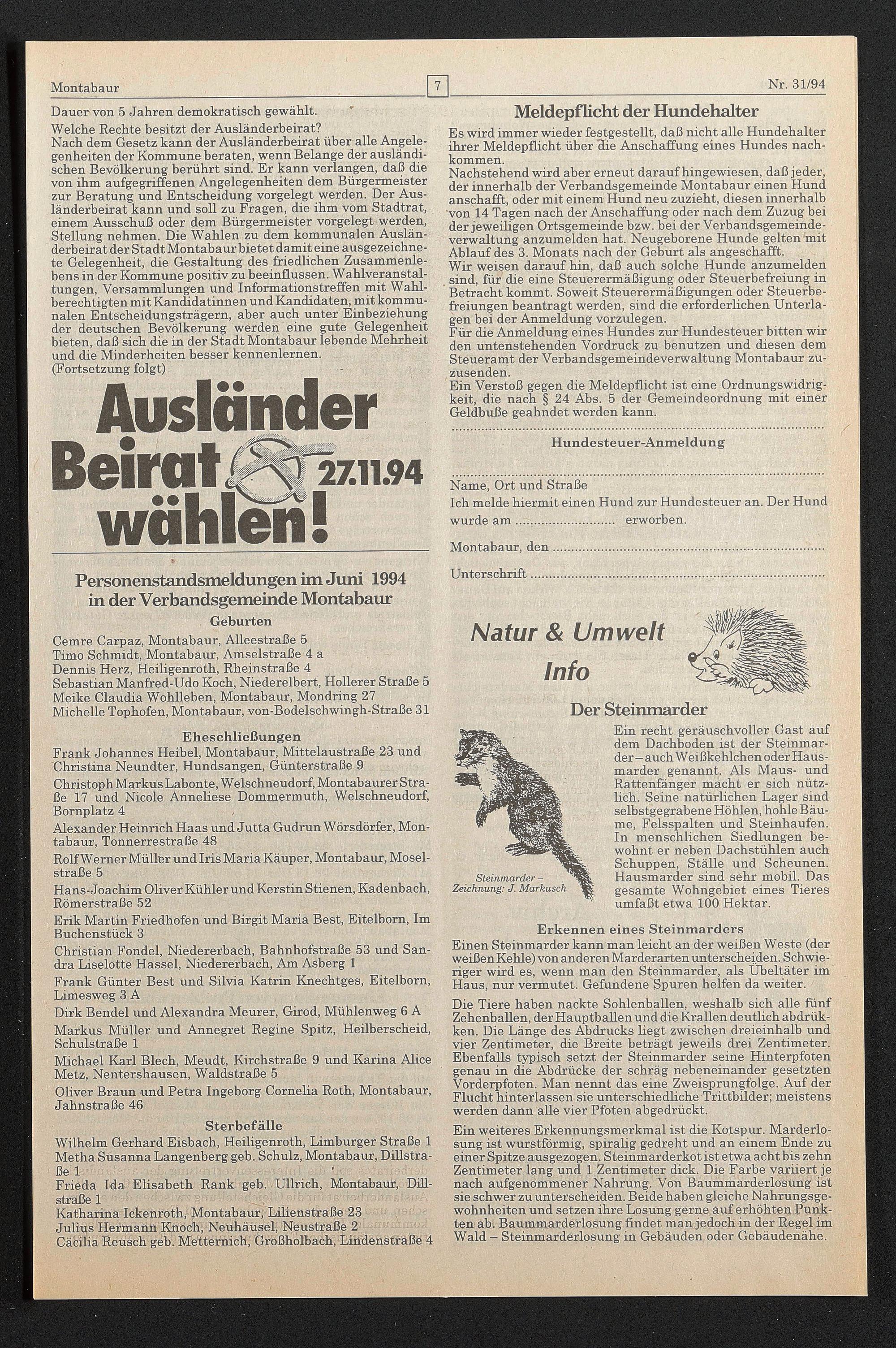 Nachstehend wird aber erneut daraufhingewiesen, daß jeder, der innerhalb der Verbandsgemeinde Montabaur einen Hund anschafft, oder mit einem Hund neu zuzieht, diesen innerhalb ‘von 14 Tagen nach der Anschaffung oder nach dem Zuzug bei der jeweiligen Ortsgemeinde bzw. bei der Verbandsgemeindeverwaltung anzumelden hat. Neugeborene Hunde gelten mit Ablauf des 3. Monats nach der Geburt als angeschafft.