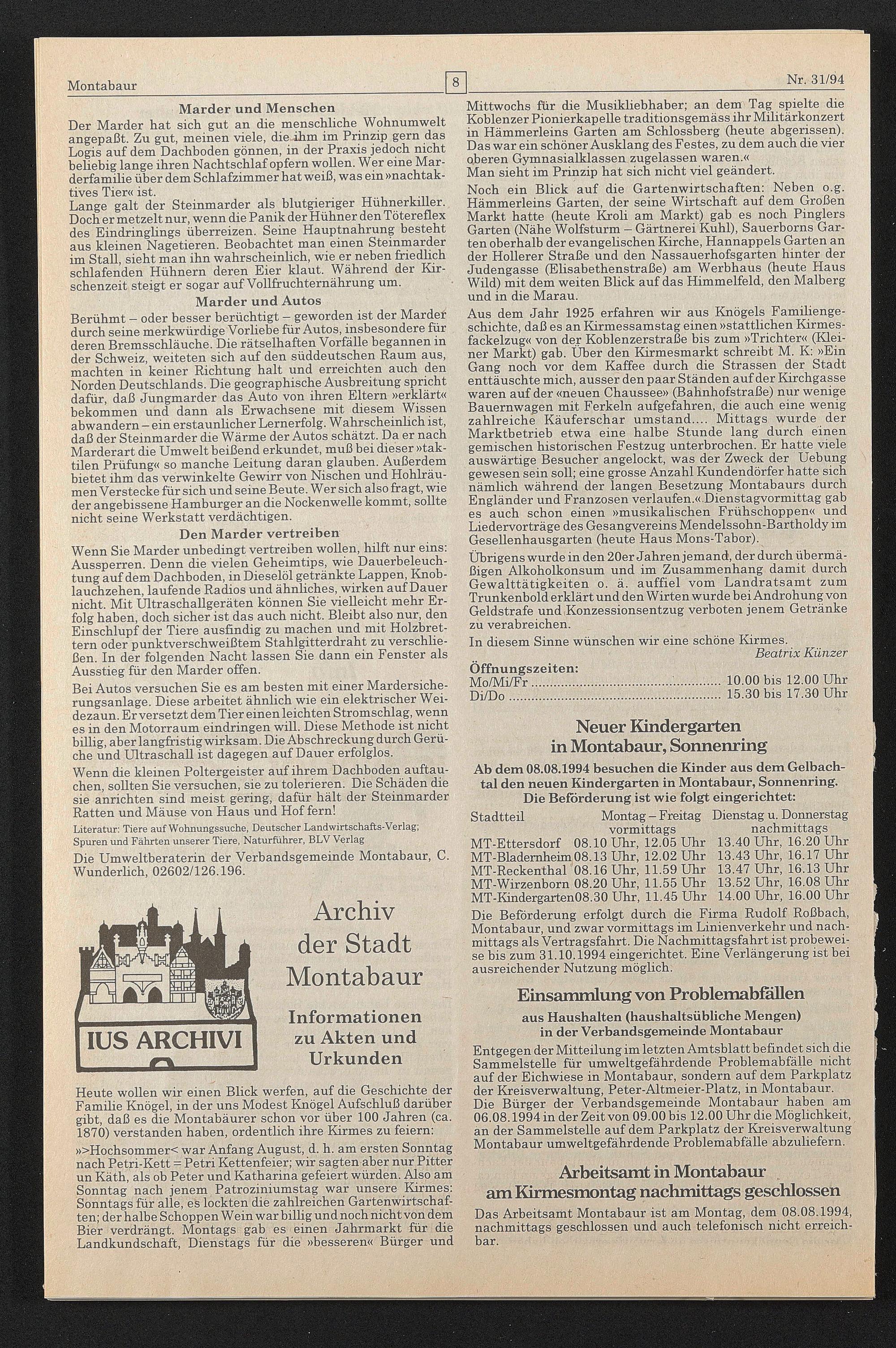 Das Arbeitsamt Montabaur ist am Montag, dem 08.08.1994, nachmittags geschlossen und auch telefonisch nicht erreichbar.