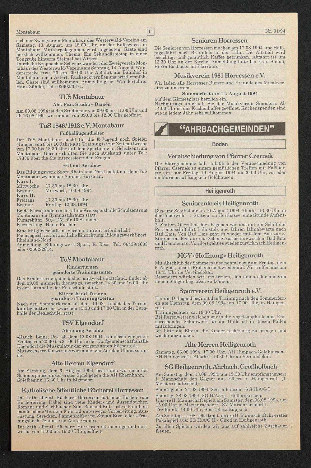 Die Pfarrgemeinde lädt anläßlich der Verabschiedung von Pfarrer Czernek zu einem gemütlichen Treffen mit Faßbier, etc. ein - am Freitag, 19. August 1994, ab 20.00 Uhr, vor oder im Mariensaal Ruppach-Goldhausen.