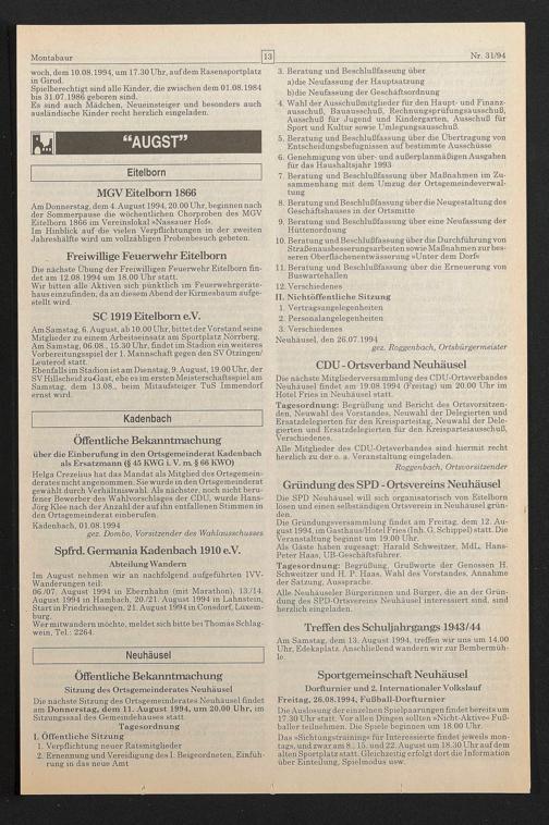 Die nächste Sitzung des Ortsgemeinderates Neuhäusel findet am Donnerstag, dem 11. August 1994, um 20.00 Uhr, im Sitzungssaal des Gemeindehauses statt.