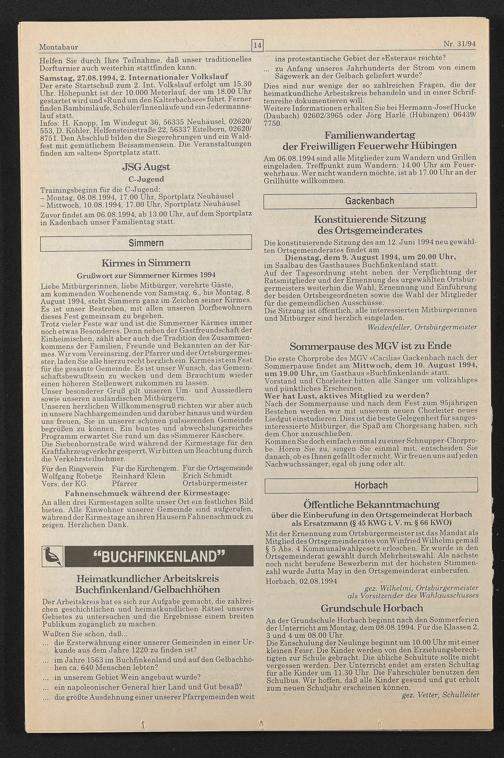 Liebe Mitbürgerinnen, hebe Mitbürger, verehrte Gäste, am kommenden Wochenende von Samstag, 6., bis Montag, 8. August 1994, steht Simmern ganz im Zeichen seiner Kirmes. Es ist unser Bestreben, mit allen unseren Dorfbewohnern dieses Fest gemeinsam zu begehen.